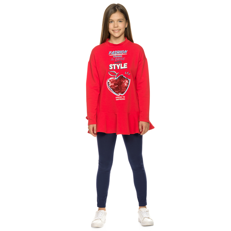 Состав: верх: 96%хлопок 4%эластан, низ: 95%хлопок 5%эластанОписание: Костюм для девочек из футера: туника и лосины. Новинка кроя! Туника более свободного силуэта со спущенным плечом, рукава, слегка за... Показать описаниеуженные книзу, по низу изделия разноуровневый волан, поднимающийся вверх по правому боковому шву, аппликация в виде яблока из двусторонних пайеток, надпись с глиттером и золотистым блеском, перевод Мода выбирает сиять со стилем. Одевайся так, чтобы произвести впечатление. Утеплённые лосины из футера увеличенной формы для удобства надевания.