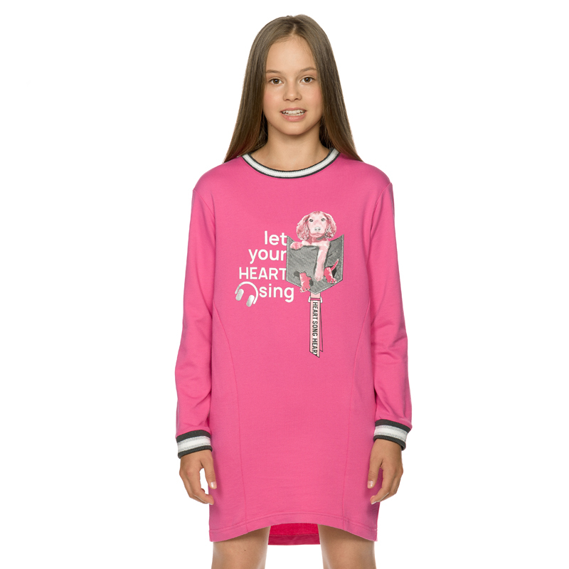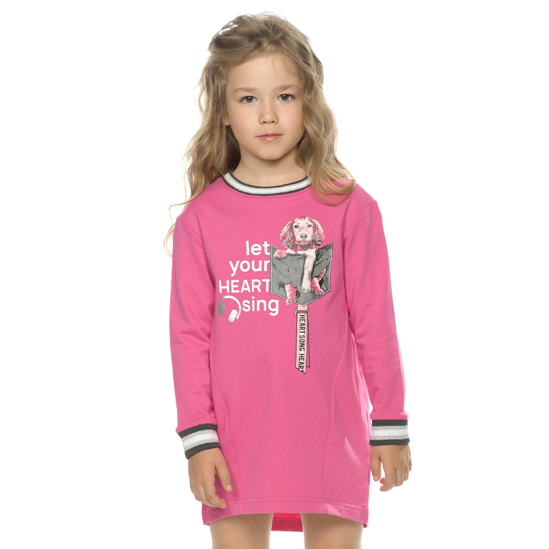Состав: 100%хлопокОписание: Платье для девочки Pelican. Сарафан из футера свободного силуэта со слегка спущенным плечом, зауженное книзу, боковые швы переведены на перед, перепад длины переда и спинки... Показать описание, рукав умеренного объема, горловина и манжеты рукавов из рибаны с люрексом. Мягкий эластичный принт с серебряным блеском. Перевод Позволь своему сердцу петь и Музыка сердца. В составе ткани качественный 100% хлопок, поэтому изделие хорошо дышит, мягкое и легкое, долго сохраняет форму даже после множества стирок, эластичное и износостойкое, практичное для регулярного применения. Материал приятный для соприкосновения с кожей. Красивая нарядная детская одежда для девочек представлена в популярном цвете: малиновый (розовый, фиолетовый). В широкой сетке маленьких, средних и больших размеров: 86, 92, 98, 104, 110 на возраст 2, 3, 4, 5, 6 лет. То есть, подойдет малышам и подросткам. Универсальный тип ростовки для высоких, среднего роста и низких. Классно сочетается с различными предметами гардероба ребёнка. Вы можете подобрать комплект в официальном каталоге селлера. Иногда такой тип одежды называют удлиненной футболкой, так как изделие обладает похожими свойствами. Подходит для кругологодичного применения: летом, зимой, весной, осенью (демисезон и в межсезонье). Одинаково практично для повседневной носки, в детский садик и школу, в домашних условиях, для путешествий и туризма, во время активных игр, прогулок с друзьями и родителями, для хобби и танцев. В таком ты понимаешь - это твое, это топ! Можно подарить дочери и внучке на праздник День рождения, 8 марта, Новый год и Рождество. Ребёнок будет в восторге от популярной молодежной вещи!