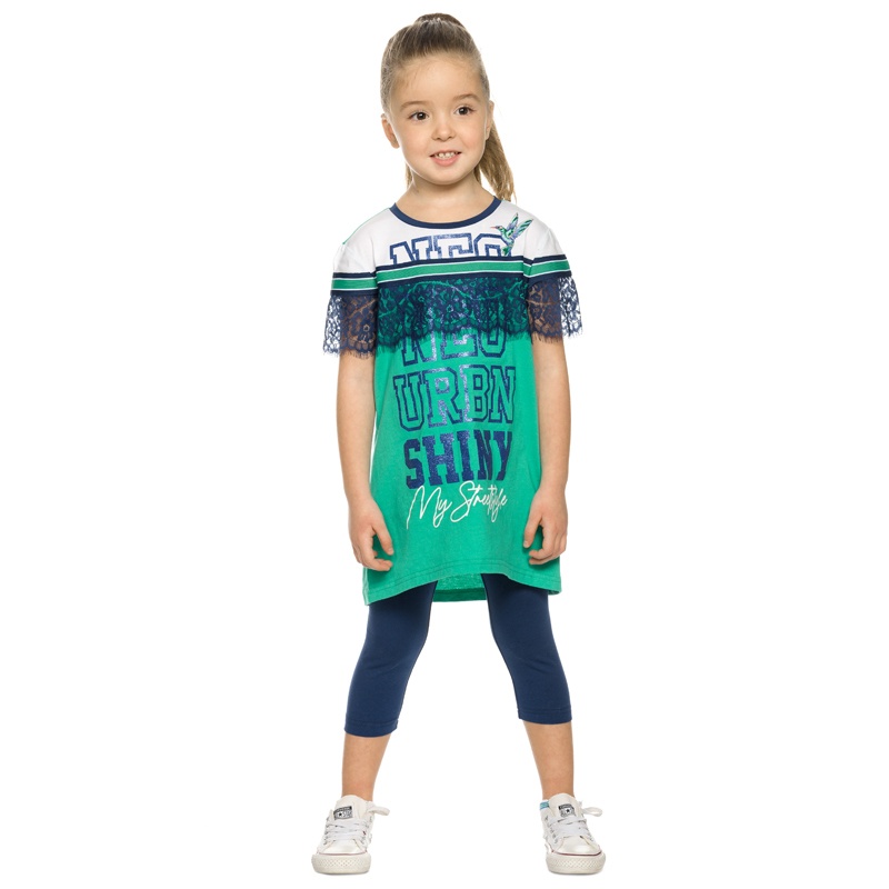 Состав: верх: 100%хлопок, низ: 95%хлопок 5%эластанОписание: Комплект для девочек туника и лосины. Новая туника из тонкого хлопка, с перепадом длины спинки и переда, прямого свободного силуэта с мягкой... Показать описание линией плеча. По линии груди спереди и рукавах горизонтальное членение, вдоль которого проходит трикотажная декоративная тесьма и мягкое воздушное кружево. Принт с разноцветным глиттером в виде птички колибри и надписей. Перевод Нео, Урбан, Блестящий, Мой стритстайл. Классические укороченные лосины.