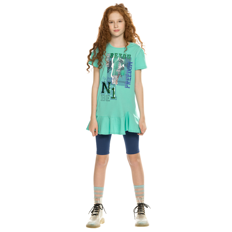 Состав: верх: 100%хлопок, низ: 95%хлопок 5%эластанОписание: Комплект для девочек туника и лосины. Туника с фигурной линией низа и притачным воланом. Необычный способ втачивания волана по переду волан ... Показать описаниевтачивается в разрез, создавая интересные фалды. Силуэт прямой, свободный, с мягкой линией плеча. Фотопринт с разноцветным глиттером и вышивкой переливающимися переворачивающимися пайетками. Перевод Вдохновляю быть свободной , Будь первой , Мой стритстайл . Велосипедки длиной до колена.
