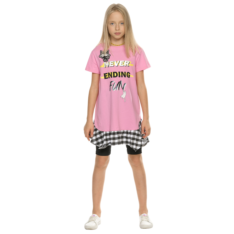 Состав: верх: 100%хлопок, низ: 95%хлопок 5%эластанОписание: Комплект для девочек туника и велосипедки. Новинка. Туника с круглым вырезом горловины, коротким втачным рукавом и фигурным клетчатым волано... Показать описанием по низу. Шрифтовая неоновая композиция с серебряным металликом и глиттером. Перевод Никогда не заканчивающееся веселье. Аппликация в виде котика из разноцветных страз. Велосипедки черного цвета длиной до колена.