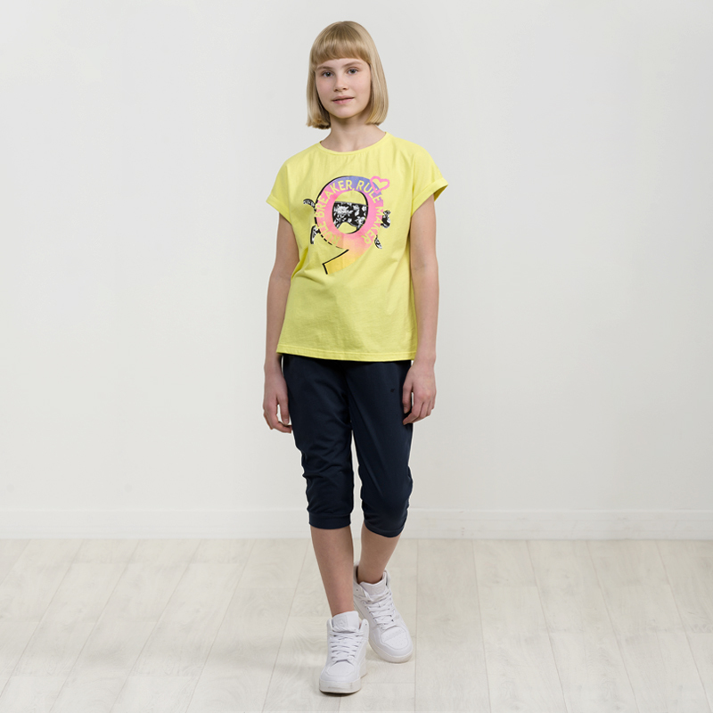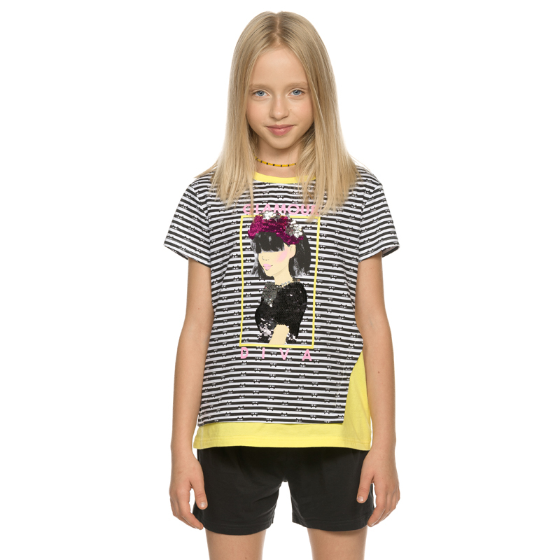 Состав: верх: 100%хлопок, низ: 100%хлопокОписание: Костюм для девочки Pelican. Детский комплект из 100% хлопка включает длинную футболку и шорты. Майка без рукавов умеренного объема с мягкой линией пл... Показать описаниееча. Декоративный эффект - имитация многослойности - одна футболка, надетая поверх другой. Верхняя полосатая, с ассиметрично срезанным боковым швом и горловиной из рибаны в цвет нижней. Нижняя желтая. Принт с замаскированными в полоски мордочками кота. По центру вышивка из переворачивающихся пайеток и неоновый принт с глиттером, перевод Гламурная дива. Модель топа с актуальными трендами сезона для самых продвинутых девчонок. Шорты умеренного объёма с защипами у пояса. Регулировка объема внутренним шнуром. Вещи из набора можно носить по отдельности, что делает его универсальным. Свободный, можно назвать оверсайз (oversize). Комплект для ребёнка представлен в классических цветах желтый, черный в размерах 116, 122, 128, 134, 140, 146. То есть, подойдет и детям средних классов и старшеклассникам на 5, 6, 7, 8, 9, 10 лет. Набор самостоятельный, то есть может применяться без другой одежды гардероба девушки. При этом, он классно сочетается с верхней одеждой и даже может быть поддевой (например, в зимний период). Подходит для кругологодичного применения: летом, осенью, зимой, весной. Супер универсальное применение: ходить в школу, на праздники (например, Новый год, 1 сентября, день учителя, выпускной) и особенные события (День рождения), использовать в повседневной жизни, дома, для спорта (включая уроки физкультуры и гимнастику), фитнеса и игровых видов спорта (волейблол, баскетбол, футбол), активных игр и хобби (танцы, хип хоп, единоборства). В такой одежде ты понимаешь - это твое, это топ, это круто! Универсальный тип ростовки товара подойдет и высоким, среднего роста и низким. Дочь или внучка будет в восторге от молодежного товара!