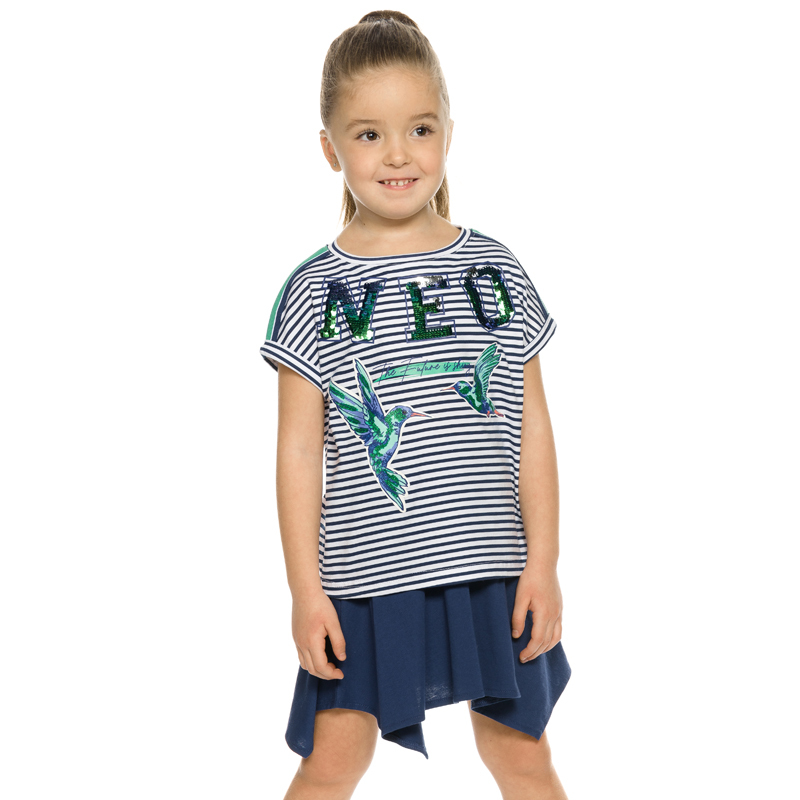 Состав: верх: 100%хлопок, низ: 60%хлопок 40%полиэстерОписание: Комплект для девочек футболка и юбка. Футболка свободного объёма с цельнокроеным рукавом с отгибающейся закрепленной манжетой. Вдоль лини... Показать описаниеи плеч настрочена декоративная трикотажная тесьма. По переду изделия принт с разноцветным глиттером в виде птичек колибри и надписи, перевод Блестящее будущее , и вышивка из переливающихся переворачивающихся пайеток. Юбка - Новинка. Прямоугольная юбка с фигурной угловатой линией низа, пояс на широкой внутренней резинке.