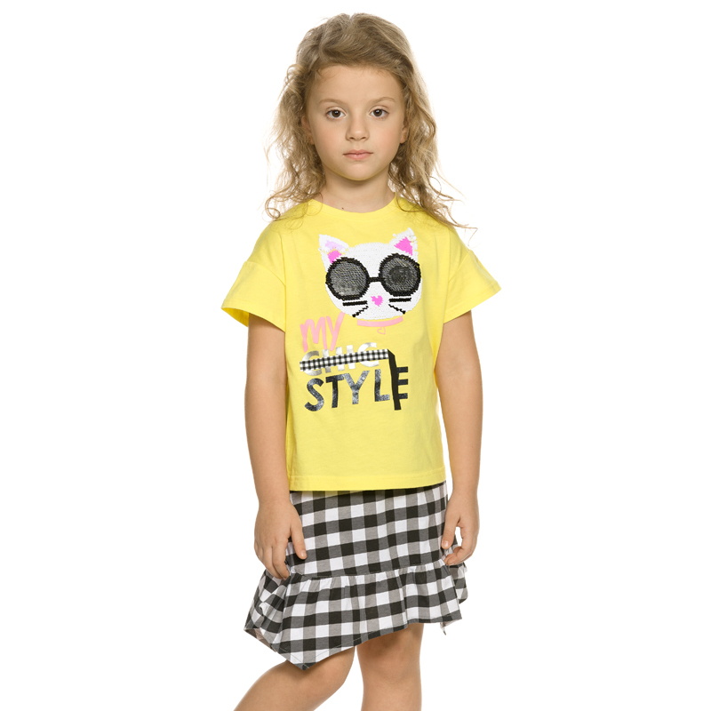 Состав: верх: 100%хлопок, низ: 100%хлопокОписание: Комплект для девочек футболка и юбка. Футболка актуального мягкого оверсайз силуэта со спущенным плечом. Интерактивная аппликация из переворачивающих... Показать описаниеся пайеток кот подмигивает, когда пайетки перевернуты на вторую сторону. НеоНовый принт с металликом и глиттером, перевод Мой шикарный стиль. Юбка Новинка. Умеренный объем, по низу юбки пришит фигурный волан. Пояс на комфортной внутренней резинке.