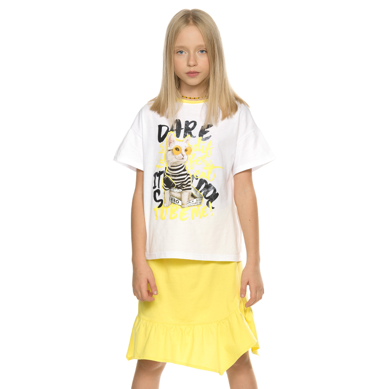 Состав: верх: 100%хлопок, низ: 100%хлопокОписание: Комплект для девочек футболка и юбка. Футболка актуального мягкого оверсайз силуэта со спущенным плечом. Фотопринт и текстовый неоНовый принт с сереб... Показать описаниеряным металликом и глиттером, перевод Осмелься быть другой. Это круто быть мной.. Юбка Новинка. Умеренный объем, по низу юбки пришит фигурный волан. Пояс на комфортной внутренней резинке.