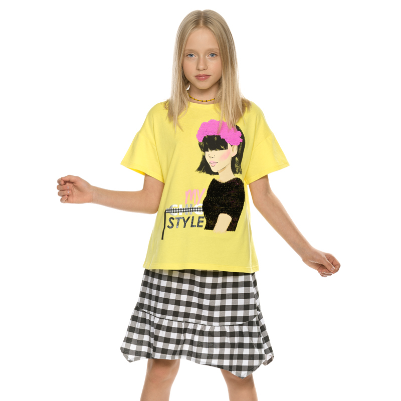 Состав: верх: 100%хлопок, низ: 60%хлопок 40%полиэстерОписание: Комплект для девочек футболка, юбка. Футболка умеренного объема, комфортной длины. Мягкий стойкий и эластичный принт с блестками. Юбка НО... Показать описаниеВИНКА. Имитация запаха, по левой половине переда рюша и вертикально настроченная полосатая репсовая лента шириной 4 см. Лента длиннее края изделия на 5 см. Мягкий пояс с широкой внутренней резинкой.