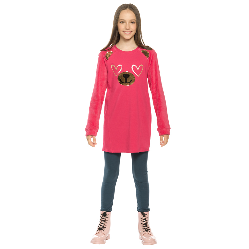 Состав: верх: 96%хлопок 4%эластан, вставка: 100%полиэстер, низ: 95%хлопок 5%эластанОписание: Костюм для девочки Pelican. В наборе 2 вещи: туника и лосины. Футболка из футера с рукавами реглан из велсо... Показать описаниефта. На переде рельефные швы, создающие силуэт лёгкий бочонок. В швах рукава вшиты декоративные ушки, расшитые золотистыми пайетками. По переду принт из мягких стойких золотых сердечек и вышивки из пайеток, имитирующие мордочку медведя. Штаны из эластичного футера с начесом. Оверсайз силуэт дарит свободу движений, комфорт во сне. Яркий принт (рисунок) придаст настроению и создаст уют. В составе ткани качественный хлопок и эластан, поэтому изделие хорошо пропускает воздух, легкое и мягкое, долго сохраняет форму даже после множества стирок, эластичное и износостойкое, практичное для регулярного применения. Материал приятный для соприкосновения с кожей. Красивая нарядная детская одежда для девочек представлена в популярном цвете: малиновый (розовый, фиолетовый). В широкой сетке маленьких, средних и больших размеров на возраст 6, 7, 8, 9, 10, 11 лет. То есть, подойдет малышам и подросткам. Универсальный тип ростовки для высоких, среднего роста и низких. Классно сочетается с различными предметами гардероба ребёнка. Вы можете подобрать комплект в официальном каталоге селлера. Подходит для кругологодичного применения: летом, зимой, весной, осенью (демисезон и в межсезонье). Одинаково практично для повседневной носки, в домашних условиях и для сна, для занятий спортом и фитнесом, путешествий и туризма, во время активных игр, прогулок с друзьями и родителями, для хобби (волейбол, баскетбол, бег, велосипед) и танцев. В таком ты понимаешь - это твое, это топ! Можно подарить дочери и внучке на День рождения, 8 марта, Новый год и Рождество. Ребёнок будет в восторге от популярной молодежной вещи!