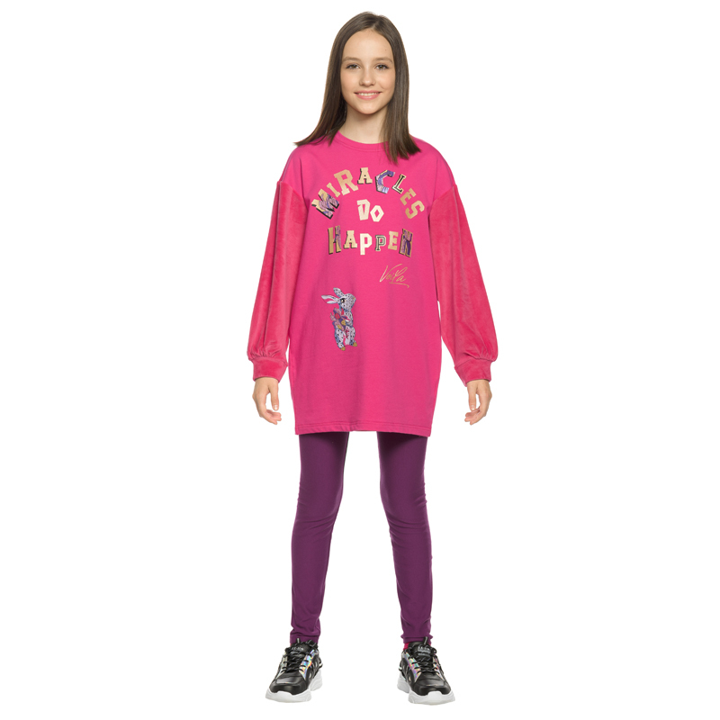 Состав: верх: 96%хлопок 4%эластан, вставка: 95%полиэстер 5%эластан, низ: 95%хлопок 5%эластанОписание: Комплект для девочек туника и лосины. Туника мягкого оверсайз силуэта со спущенной линией плеча. П... Показать описаниееред и спинка из футера, рукава из мягкого плюшевого велюра с перламутровым отблеском. Эластичный rubber принт с золотым металликом и глиттером. Надпись Чудеса случаются. Вуаля. Низ Классические лосины из футера с начесом.