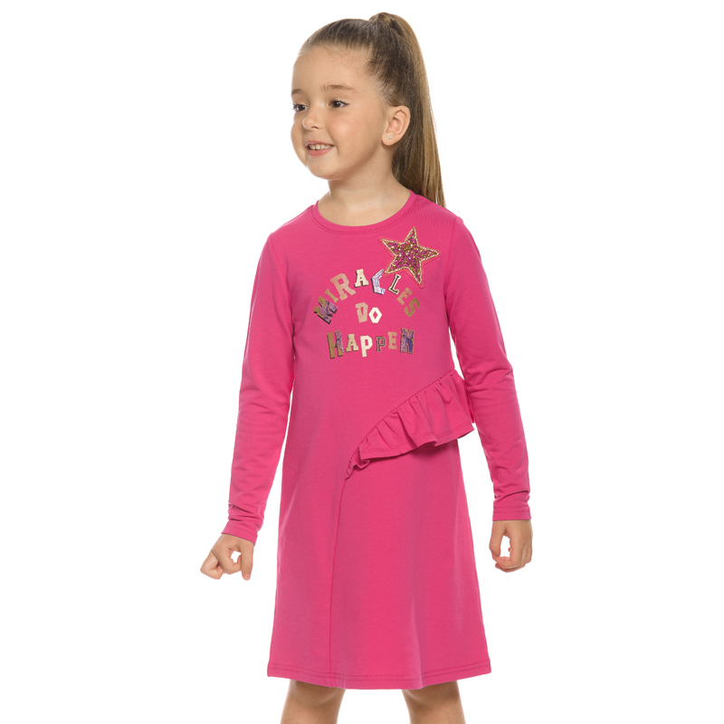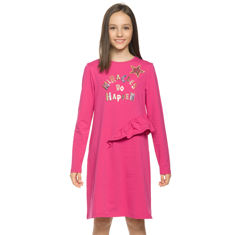 Состав: 75%хлопок 20%полиэстер 5%эластанОписание: Платье для девочки Pelican. Модель из футера А силуэта. Аккуратный втачной рукав, небольшая горловина. Фишка сарафана - декоративный асимметричный рел... Показать описаниеьеф необычной округлой формы по переду и по спинке до низа изделия. В рельеф вставлен волан. Rubber принт с золотым металликом и глиттером. Надпись Чудеса случаются. Вуаля. В составе ткани качественный полиамид, эластан, вискоза, поэтому изделие мягкое и легкое, долго сохраняет форму даже после множества стирок, эластичное и износостойкое, по-минимуму электризуется, не пилингуется (без образования катышек), практичное для регулярного применения. Материал приятный для соприкосновения с кожей. Новогоднее платье станет настоящим украшением вашей девочки на утреннике или любом другом празднике. Это нарядное платье, разработанное дизайнерами специально для девочек от 5 до 11 лет, идеально подойдет для детского сада и начальной школы и для праздничных мероприятий. Модель прямого покроя с длинными рукавами и миди длиной юбки сделана из мягкого и приятного к телу трикотажа, который не стесняет движений. Праздничный вид платью придают нашивка в виде звезды, блестки и воланы. Благодаря универсальному малиновому или розовому цвету, платье будет уместно как на каждый день, так и для особых случаев.