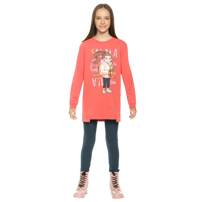 Состав: верх: 100%хлопок, низ: 95%хлопок 5%эластанОписание: Комплект для девочек туника и лосины. Туника О силуэта со слегка спущенным плечом и манжетами из основной ткани. Низ изделия обработан двумя... Показать описание разноуровневыми манжетами. Принт стилизованный прототип героини истории. Вот она в кроссах, джинсах и металлизированной куртке. Копирайт с золотым металликом ФАЛАЛА. Классические длинные лосины.
