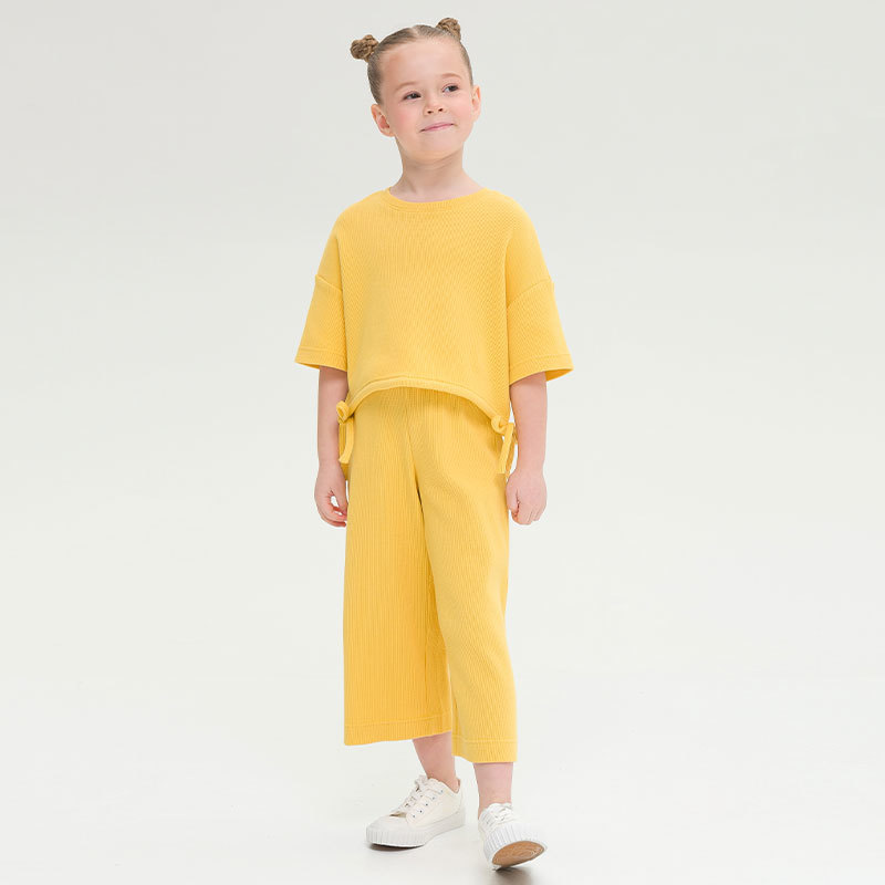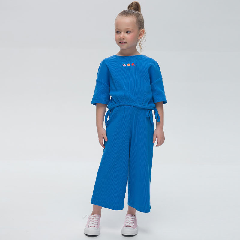 Состав: верх: 95%хлопок 5%эластан, низ: 95%хлопок 5%эластанОписание: Комплект для девочки летний станет самым любимым нарядом в гардеробе модницы. Костюм нарядный из вафельного трикотажа отлично пропу... Показать описаниескает воздух и в нем не жарко. Набор одежды на лето - это короткая футболка оверсайз силуэта, кроп топ с утяжками понизу изделия, которые завязываются по бокам и укороченные свободные брюки длиной 7/8 прямого силуэта. Пояс на резинке для идеальной посадки. Удобно надевать и быстро снимать. Идеальная летняя детская одежда для малыша и подростка дарит свободу движения и комфорт. Хлопок приятен к телу, благодаря гигроскопичным свойствам впитывает влагу во время активных игр и быстро высыхает, а также не вызывает раздражений. Подойдет для повседневной носки, как нарядный, отдыха на море, пляжа и как домашний предмет одежды.