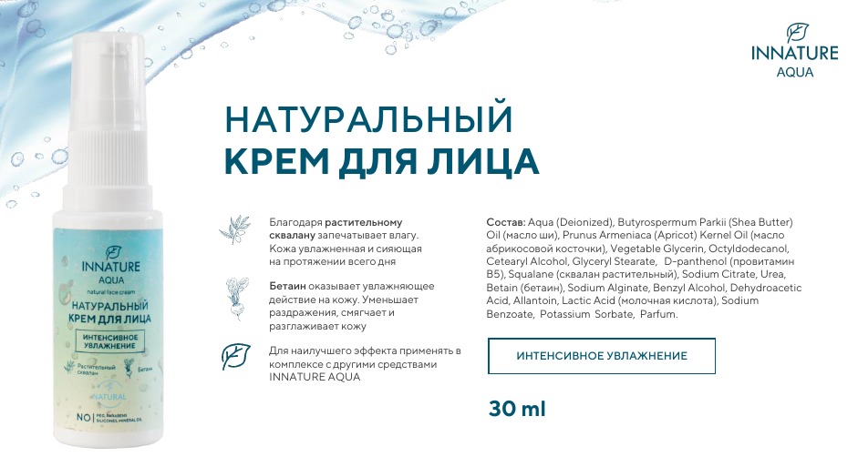 Натуральная сыворотка-концентрат глубоко проникает в эпидермис, доставляя активные вещества, благодаря этому она моментально делает кожу увлажненной. Гиалуроновая кислота убирает ощущение сухости и ст... Показать описаниеянутости. Витамин Е борется с шелушениями и продлевает молодость. Серия INNATURE AQUA создана специально для кожи, которая нуждается в интенсивном увлажнении.