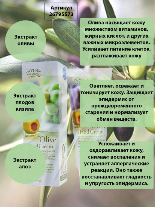 Увлажняющий крем для рук с экстрактом оливы эффективно питает и смягчает, быстро впитывается, мгновенно улучшая состояние кожи рук. Экстракт оливы насыщает комплексом витаминов, жирных кислот, флавоно... Показать описаниеидов и микроэлементов, смягчает огрубевшую и восстанавливает сухую кожу рук. Экстракт плодов кизила осветляет, освежает и тонизирует кожу, замедляет окислительные процессы, препятствуя преждевременному старению. Экстракт алоэ оказывает увлажняющее, успокаивающее и заживляющее действие, устраняет воспаления и аллергические реакции, восстанавливает гладкость и упругость эпидермиса. Способ применения: нанесите крем на чистую кожу рук массажными движениями.