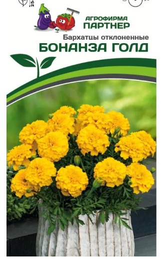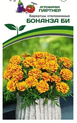 БОНАНЗА — бесспорный лидер среди тагетеса отклоненного с превосходными показателями декоративности! Сочетает в себе очень раннее и в то же время невероятно длительное цветение. Идеально выравненные ма... Показать описаниехровые цветки насыщенных теплых оттенков раскрываются один за другим и долго не увядают. На смену им появляются все новые и новые бутоны, и эта цветочная феерия продолжается с весны и до поздней осени. Благодаря превосходному ветвлению и сильным побегам растение формирует шаровидный куст диаметром до 20 см, сохраняет компактность и продолжительно цветет до заморозков без вытягивания и полегания. Все это время бархатцы будут выглядеть аккуратно и ярко, причем без особых усилий с вашей стороны. Серия Бонанза зарекомендовала себя отличными показателями устойчивости к капризам погоды и неприхотливостью в уходе. Бордюры, рабатки, клумбы и контейнеры с ними всегда смотрятся эффектно и одновременно очень тепло и душевно. Рекомендуемый объем кашпо — 2-3 л на одно растение и схема посадки в грунте — 20х20 см. Практический совет: - перед посевом необходимо провести обеззараживание инвентаря и грунта (желательно использовать торфяной субстрат с pH 6,2-6,5); - семена располагайте на глубине не более 0,5 см, слегка присыпая грунтом (вермикулитом); - емкости накройте стеклом или пленкой и содержите посевы при температуре +21°+22°С до момента прорастания; - следите за влажностью посевов, проветриванием и защищайте от попадания прямых солнечных лучей.