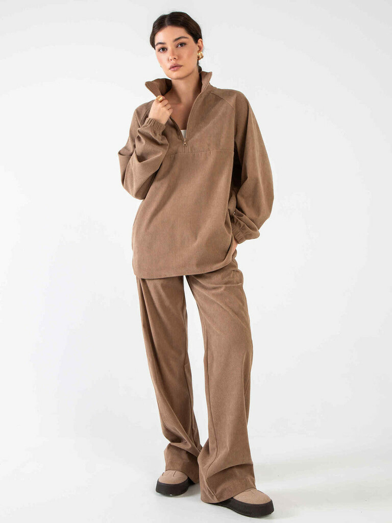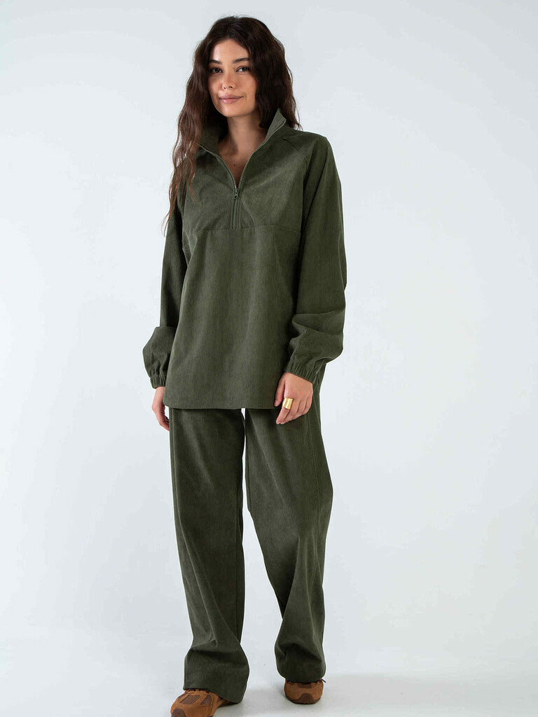 Ткань: микровельвет. Состав: 65% п/э, 30% вискоза, 5% эластан. Цвет: хаки. Карманы: в боковых швах брюк. Длина готового изделия брюки с учетом резинки: 44/ 93 см, 46/ 93 см, 48/ 93 см, 50/ 94 см, 52/ ... Показать описание94 см, 54/ 94 см. Рост модели: 168 см. Брюки с высокой посадкой, талия на широкой резинке. В боковых швах есть карманы. Такой костюм идеален для создания повседневного образа современной девушки. По низу брюки декорированы защипами. Уход за изделием: ручная стирка до 30 градусов; нельзя отбеливать; деликатный отжим; гладить при t не более 110 С; гладить с изнанки. *Допуск отклонения длины при массовом производстве 1-3 см является нормой.