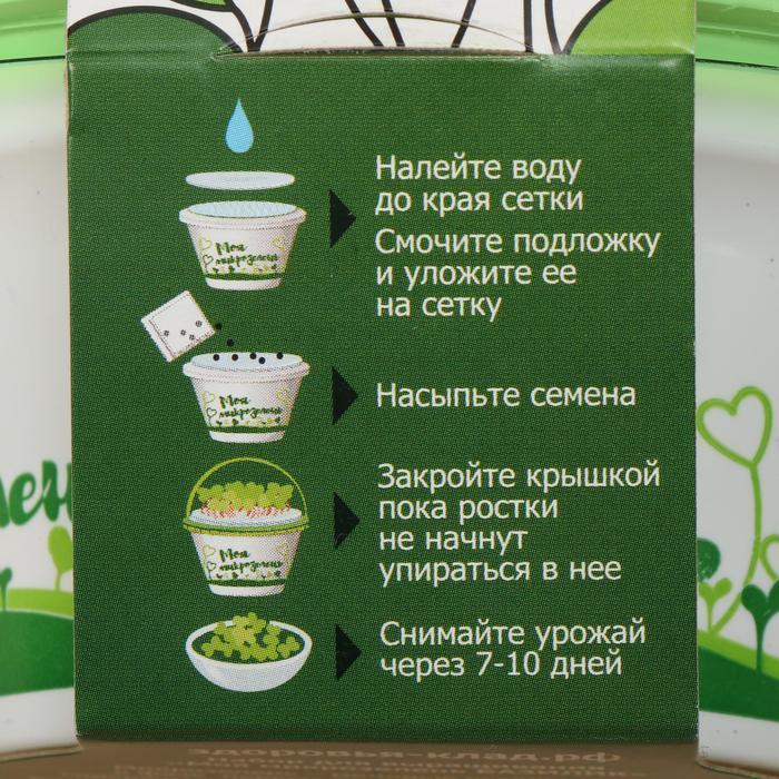 Набор предназначен для выращивания микрозелени в домашних условиях. В набор входит: * ёмкость – 1 шт.; * крышка – 1 шт.; * сетка – 1 шт.; * подложка – 1 шт.; * семена кресс-салата – 1 пакетик. Кресс-с... Показать описаниеалат обладает насыщенным вкусом, содержит быстрый доступ к витаминам А, С, К, а также множеству микроэлементов, хорошо способствует быстрому метаболизму. Этапы использования 1. Налейте воду до края сетки. Смочите подложку и уложите её на сетку. 2. Равномерно высадите семена. 3. Закройте крышкой, пока ростки не начнут упираться в неё. 4. Снимайте урожай через 7-10 дней.