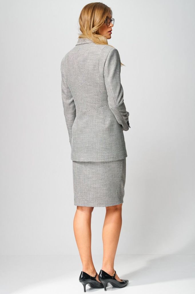 Состав: Вискоза-44%; ПЭ-53%; Эластан-3%; Шикарный офисный костюм от LAIKONY, состоящий из жакета и юбки. Жакет прилегающего силуэта, на подкладке. Воротник отложной пиджачного типа, застежка цен... Показать описаниетральная на 1 петлю и пуговицу. Перед жакета с вытачками, на нижних частях расположены горизонтальные прорезные карманы с рамками, на левой детали вверху расположена листочка с настрочными концами. Спинка с рельефными швами и со средним швом, нижняя часть с двумя талиевыми вытачками. Рукава втачные двухшовные, заканчиваются закрытыми шлицами, на которых прикреплены декоративно по 4 пуговицы. Юбка плотно облегающая вверху и зауженная к низу, на подкладке, длиной до коленей. Застежка на потайную тесьму-молнию в среднем шве заднего полотнища. Переднее полотнище юбки с запахом фигурной формы, вверху с горизонтальным подрезом и со складкой. Заднее полотнище со средним швом, на каждой половинке обработаны по две вытачки. Верхний срез юбки обработан обтачкой. Декор может отличаться от представленного на фотографии. Длина жакета по спинке 70,5 см., длина рукава 62 см. Длина юбки 58-59 см. в зависимости от размера. Наш идеальный офисный костюм вы можете дополнить топом L-037 (на фото).