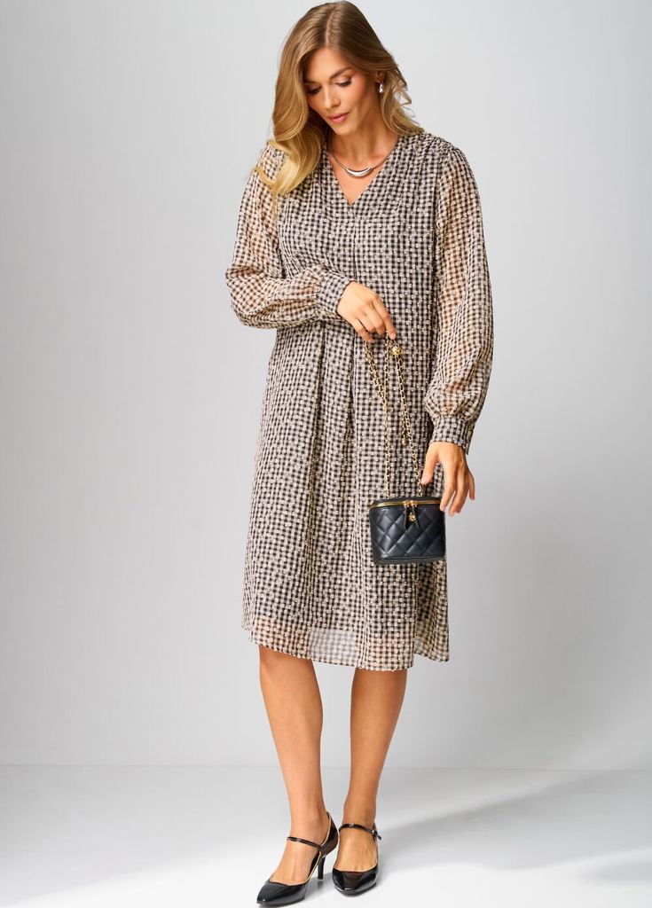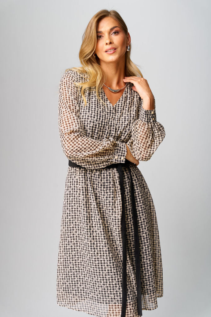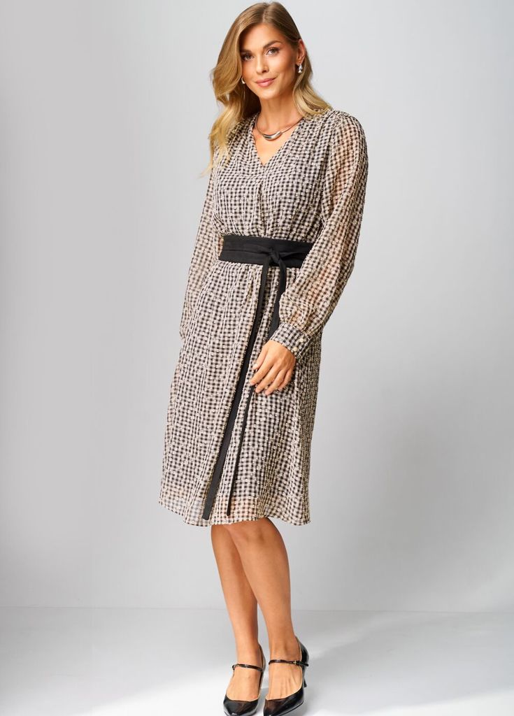 Состав: ПЭ-100%; Платье женское, повседневное, на подкладке,свободного силуэта, расширенное книзу, длиной ниже коленей, с втачными рукавами, со съемным поясом. Вырез горловины детали переда платья «V-... Показать описаниеобразной» формы, по центру обработана складка. По плечевым швам обработана сборка. Рукава втачные одношовные, с притачными манжетами, с застежкой на 2 петли и 2 пуговицы. Разрезы обработаны окантовкой, по швам притачивания обработана сборка. Платье: длина рукава - 61см, ширина рукава – 21см, длина спинки – 107см.