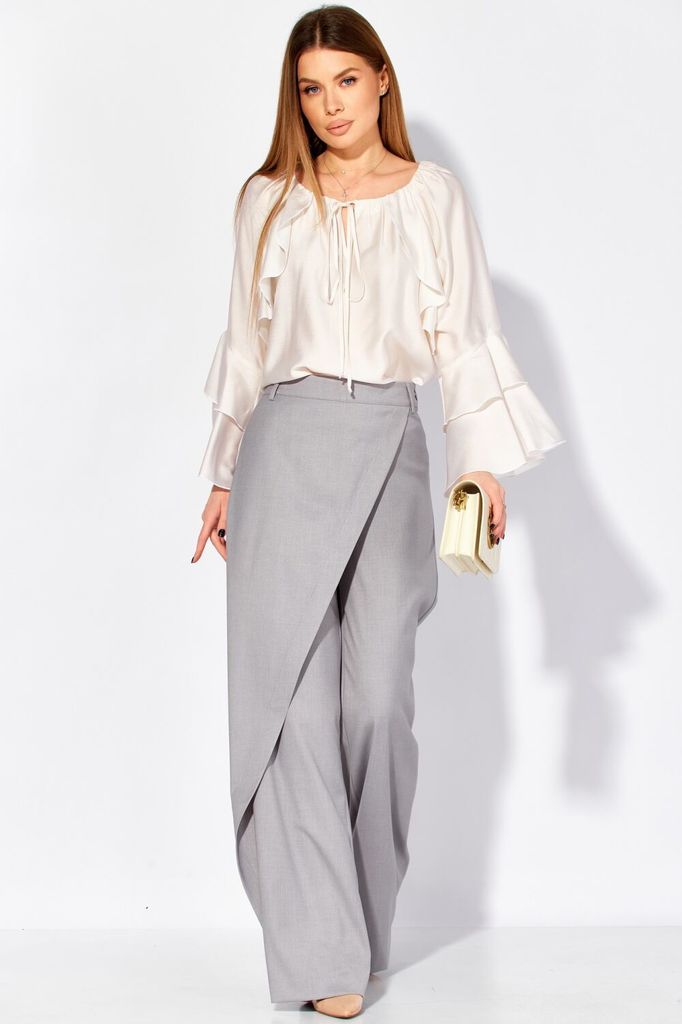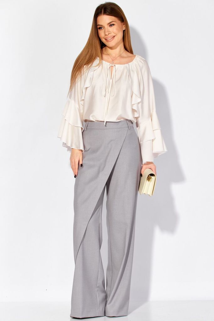 Состав: Вискоза-12%; ПЭ-88%; Нарядная блуза от LAIKONY свободного силуэта из шифона. Блуза длиной до линии бедер с центральной застёжкой на декоративную тесьму-молнию. Вырез горловины блузки «под горл... Показать описаниео», обработан планкой. Деталь переда и спинки с кокеткой из отделочной ткани, в шов вставлены два волана. Деталь переда кокетки со средним швом, с разрезом и по горловине вставлена тесьма-шнур. Рукава втачные одношовные, понизу собраны на эластичную тесьму. В низ блузки вставлена эластичная тесьма. Длина изделия по спинке 61 см длина рукава 64 см. Наша блуза составит нарядный образ с брюками L-942-2 (на фоото) - и вы будете блистать на любом торжественном мероприятии.