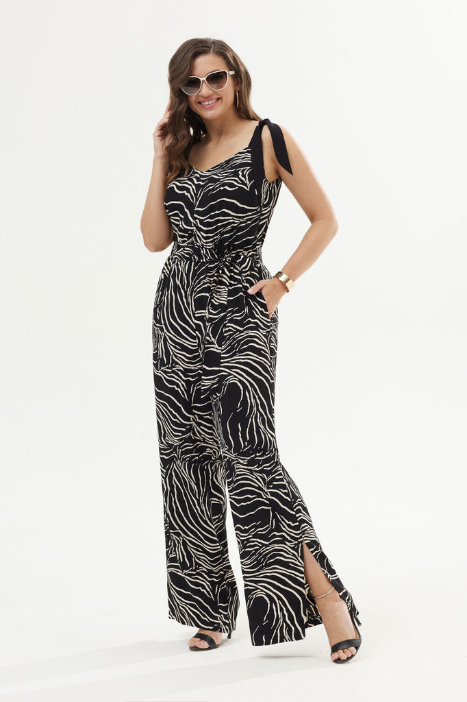 Состав: Вискоза-18%; ПЭ-80%; Спандекс-2%; Комбинезон женский отрезной по линии талии, со спущенной линией плеча понизу с отделочной тесьмой «бахрама», с притачным поясом и съёмным завязывающимся поясо... Показать описанием по линии талии. С застёжкой по среднему шву спинки на потайную молнию. Лиф переда на запах. Лиф спинки с талевыми выточками. Брюки расширенного силуэта, передние части с косыми боковыми карманами, задние с талевыми выточками.