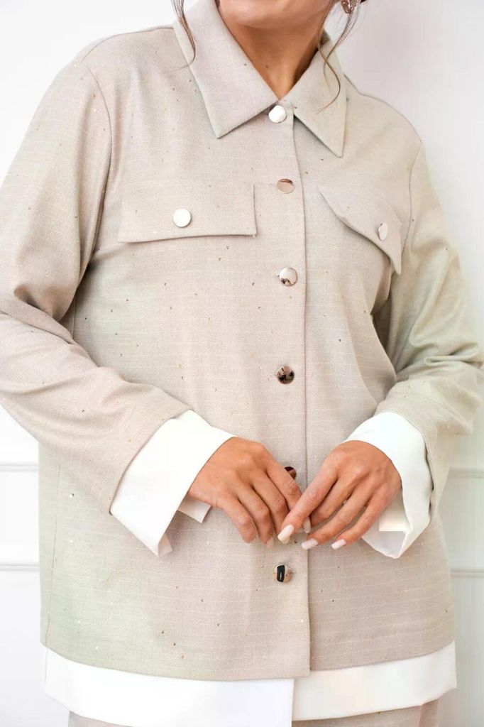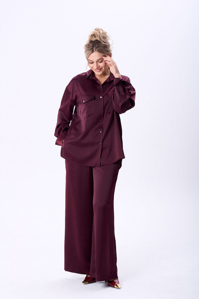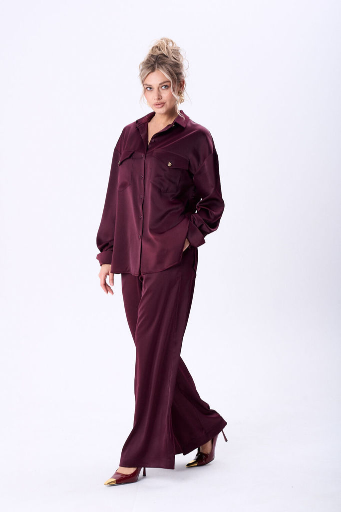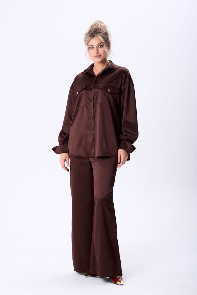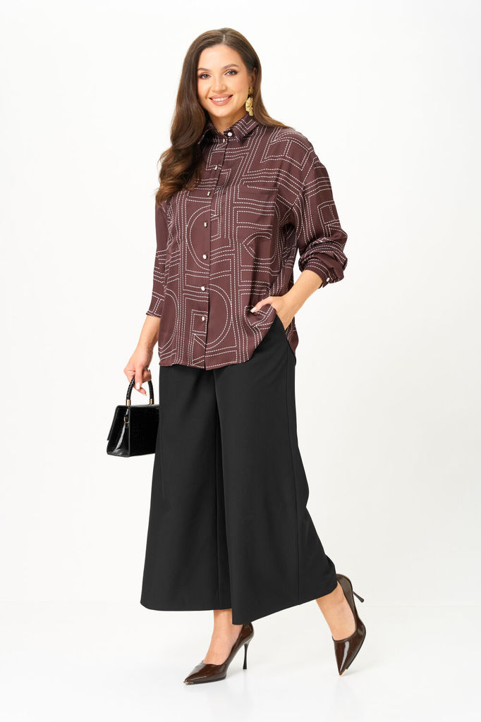 Состав: Вискоза-62%; ПЭ-32%; Спандекс-6%; Костюм женский из вискозной ткани с сатиновым блеском свободного силуэта что обеспечит комфорт и идеальную посадку. Рубашка полуприлегающего силуэта со спущен... Показать описание ной линией плеча, с центральной застежкой на петли и пуговицы, воротник рубашечный. На полочке в области груди настрочены накладные карманы и клапаны, которые фиксируются на петлю и пуговицу. Рукав длинный по низу притачная манжета, застегивающаяся на петлю и пуговицу. По спинке обработана двойная кокетка, для более комфортной посадки спинка присборена по шву притачивания кокетки. Брюки прямого силуэта, в боковых швах обработан карман с отрезным бочком, верхний срез брюк обработан притачным поясом с эластичной тесьмой, благодаря чему брюки садятся на любую фигуру. Наименование измерений Размеры (см) Допустимые(см) отклонения +/- 46 48 50 52 54 56 Обхват груди 92 96 100 104 108 112 Обхват бедер 100 104 108 112 116 120 Обхват талии 74 76 82 86 90 94 Рост 170 170 170 170 170 170 Длина спинки 74 74 74 74 74 74 +/- 1см. Ширина спинки 53 53 53 56 56 56 +/- 1см. Ширина изделия на уровне глубины проймы 120 124 128 132 136 140 +/- 1см. Ширина изделия на уровне линии талии 118 122 126 130 134 138 +/- 1см. Ширина изделия на уровне линии бёдер 120 124 128 132 136 140 +/- 1см. Ширина изделия в низу 120 124 128 132 136 140 +/- 1см Длина рукава 60 60 60 60 60 60 +/- 1см Ширина рукава в низу 25 25 25 28 28 28 +/- 1см Ширина рукава в верху 42 44 46 48 50 52 +/- 1см Ширина плеча 24 24 24 24 24 24 +/- 1см Брюки Наименование измерений Размеры (см) Допустимые(см) отклонения +/- 46 48 50 52 54 56 Обхват груди 92 96 100 104 108 112 Обхват талии 74 76 82 86 90 94 Обхват бедер 100 104 108 112 116 120 Рост 170 170 170 170 170 170 +/- 1см. Длина брюк по боковому шву 107 107 107 107 107 107 +/- 1см. Ширина брюк по линии бедер 108 112 116 120 124 128 +/- 1см. Ширина брюк по линии талии без учета резинки 98 102 106 110 114 118 +/- 1см. Ширина брюк по линии талии с учетом резинки 66 70 74 78 82 86 +/- 1см. Ширина брюк внизу изделия 72 74 76 78 80 82 +/- 1см. Ширина пояса 4 4 4 4 4 4 +/- 1см Ширина брюк на уровне колена 66 68 70 72 74 76 +/- 1см. Длина брюк по шаговому шву 80 80 80 80 80 80 +/- 1см.