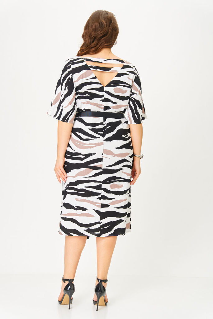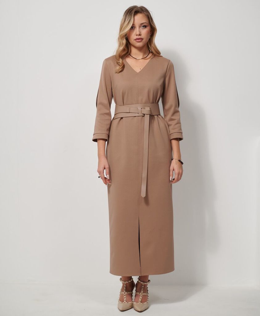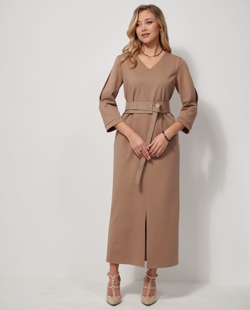 Состав: Вискоза-68%; ПЭ-28%; Спандекс-4%; Платье прямого силуэта из мягкого трикотажного полотна в рубчик. Горловина V- образная, по спинке для удобства вставлена потайная молния. Полочка со средним ш... Показать описание вом в котором по низу обработан разрез. Рукав втачной длинной 7/8 по центру рукава разрез длинной до локтя, по низу притачная манжета. Платье дополнено съемным поясом Наименование измерений Размеры (см) Допустимые(см) отклонения +/- 44 46 48 50 52 54 Обхват груди 88 92 96 100 104 108 Обхват бедер 96 100 104 108 112 116 Рост 170 170 170 170 170 170 +/- 1см. Длина спинки 128 128 128 128 128 128 +/- 1см. Ширина спинки 36 36 36 40 40 40 +/- 1см. Ширина изделия на уровне глубины проймы 94 98 102 106 110 114 +/- 1см. Ширина изделия на уровне линии бедра 100 104 108 112 116 120 +/- 1см. Ширина изделия по линии талии 74 76 82 86 90 94 +/- 1см. Ширина изделия в низу 104 108 112 116 120 124 +/- 1см Длина рукава 47 47 47 47 47 47 +/- 1см. Ширина рукава в веху 35 37 39 42 44 46 +/- 1см. Ширина рукава в низу 22 22 22 25 25 25 +/- 1см.
