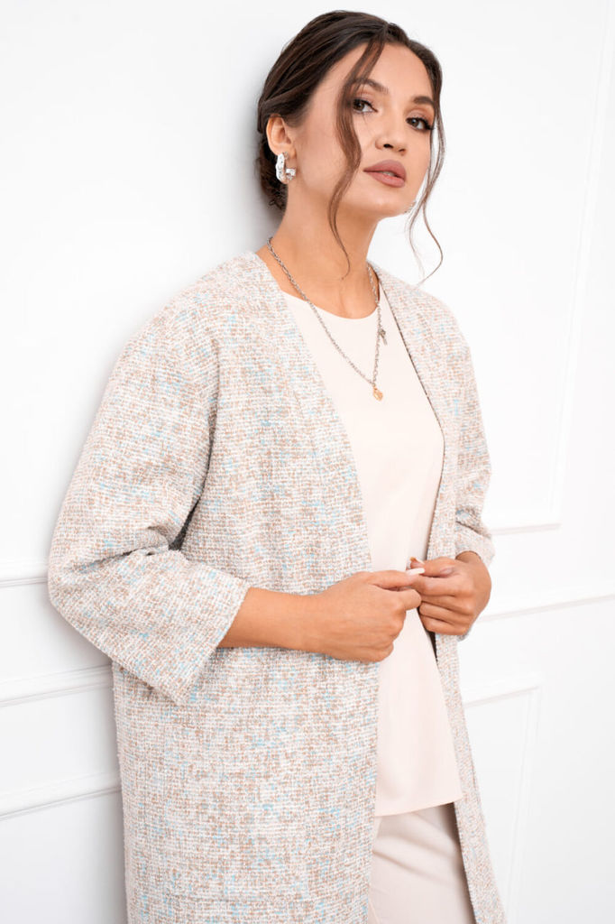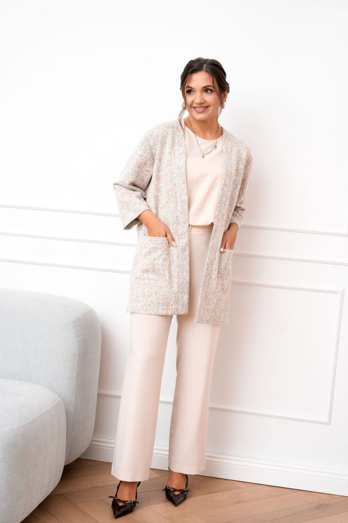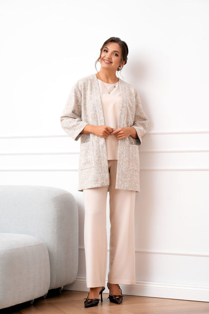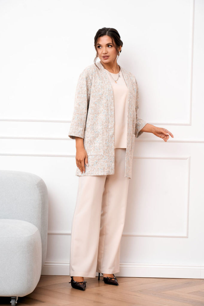 Состав: Кардиган: Вискоза-65%; Нейлон-5%; ПЭ-35%; Костюм: Вискоза-27%; ПЭ-70%; Спандекс-3%; Костюм женский тройка, состоящий из облегчённого жакета, блузки и брюк. Жакет удлинённый выполнен из трикота... Показать описание жа букле прямого силуэта, линия плеча слега спущена, рукав длинной 7/8. Застежка центральная на притачных планках, по полочке в области бёдер обработаны накладные карманы. Брюки прямого силуэта с центральной застёжкой на тесьму молнию и петлю, и пуговицу. Верхний срез брюк обработан притачным поясом по талии с эластичной тесьмой для лучшей посадки и шлёвками для ремня. Блузка полуприлегающего силуэта без рукавов со слегка спущенной линией плеча, вырез горловины круглый по спинке для удобства обработана капелька, застёгивающаяся на петлю и пуговицу. Низ по боковым швам закруглённый переходящий в небольшие разрезы. Наименование измерений Размеры (см) Допустимые (см) отклонения 48 50 52 54 56 Обхват груди 96 100 104 108 112 Обхват бедер 104 108 112 116 120 Обхват талии 76 82 86 90 94 Рост 170 170 170 170 170 Длина спинки 67 67 67 67 67 +/- 1см. Ширина спинки 43 43 46 46 46 +/- 1см. Ширина изделия на уровне глубины проймы 110 114 118 122 126 +/- 1см. Ширина изделия на уровне линии талии 108 112 116 120 124 +/- 1см. Ширина изделия в низу 112 116 120 124 128 +/- 1см. Ширина плеча 13 13 13 13 13 +/- 1см. Брюки Наименование измерений Размеры (см) Допустимые (см) отклонения 48 50 52 54 56 Обхват груди 96 100 104 108 112 Обхват талии 76 82 86 90 94 Обхват бедер 104 108 112 116 120 Рост 170 170 170 170 170 Длина брюк по боковому шву 108 108 108 108 108 +/- 1см. Ширина брюк по линии бедер 108 112 116 120 124 +/- 1см. Ширина брюк по линии талии без учета резинки 76 80 84 88 92 +/- 1см. Ширина брюк по линии талии с учетом резинки 90 94 98 102 106 +/- 1см. Ширина брюк внизу изделия 51 53 55 57 59 +/- 1см. Ширина пояса 4 4 4 4 4 +/- 1см. Ширина брюк на уровне колена 53 55 57 59 61 +/- 1см. Длина брюк по шаговому шву 79 79 79 79 79 +/- 1см. Жакет Наименование измерений Размеры (см) Допустимые (см) отклонения 48 50 52 54 56 Обхват груди 96 100 104 108 112 Обхват бедер 104 108 112 116 120 Обхват талии 76 82 86 90 94 Рост 170 170 170 170 170 Длина спинки 83 83 83 83 83 +/- 1см. Ширина спинки 45 45 48 48 48 +/- 1см. Ширина изделия на уровне глубины проймы 108 112 116 120 124 +/- 1см. Ширина изделия на уровне линии талии 106 110 114 118 122 +/- 1см. Ширина изделия на уровне линии бёдер 110 114 118 122 126 +/- 1см. Ширина изделия в низу 110 114 118 122 126 +/- 1см. Длина рукава 45 45 45 45 45 +/- 1см. Ширина рукава в низу 32 32 35 35 35 +/- 1см. Ширина рукава в верху 42 44 46 48 50 +/- 1см. Ширина плеча 17 17 17 17 17 +/- 1см.