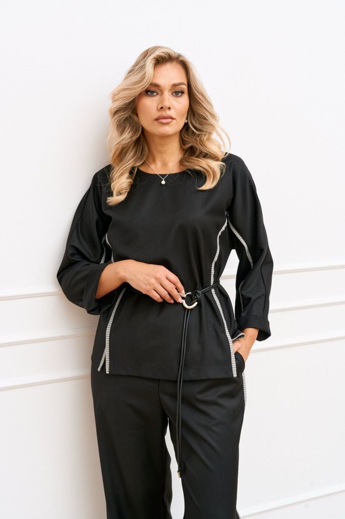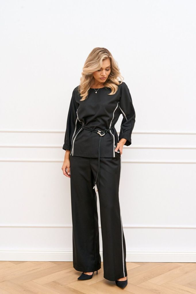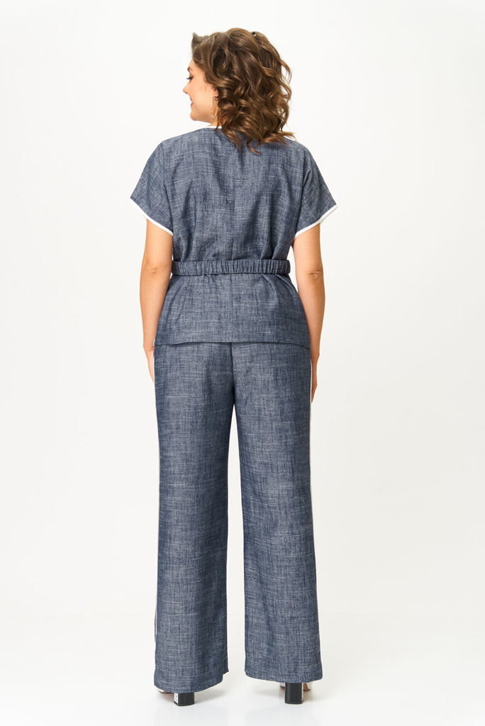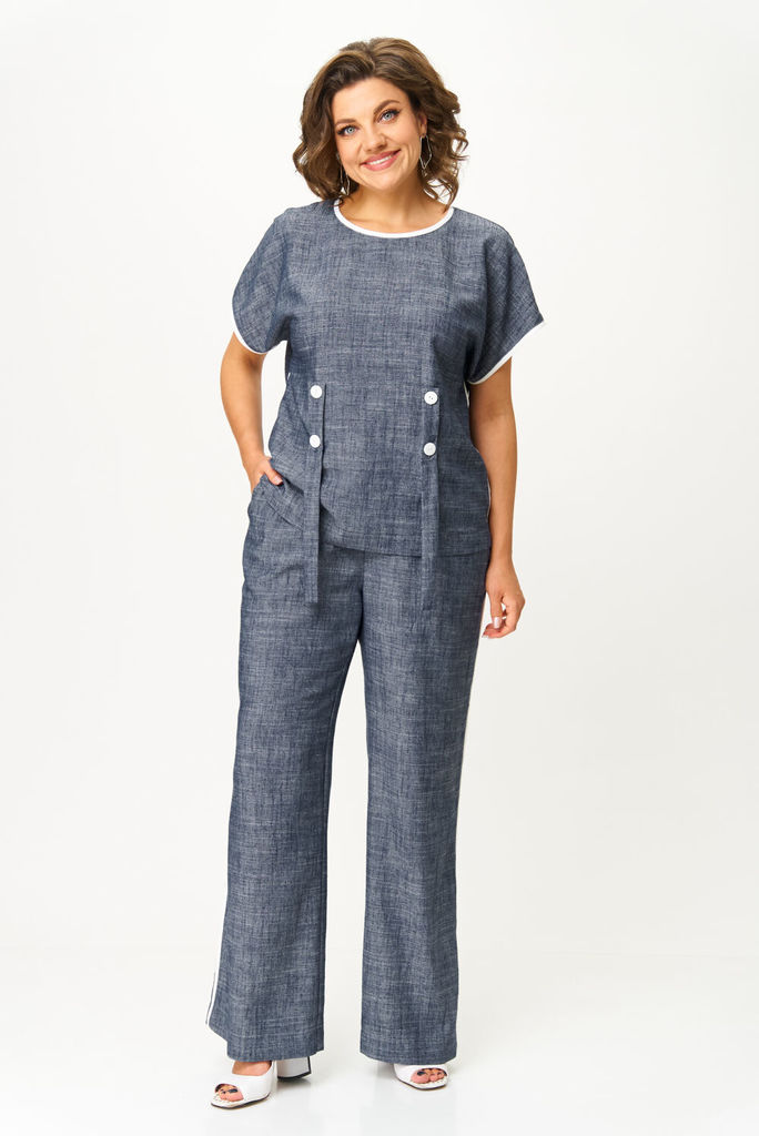 Состав: Вискоза-70%; Лён-30%; Базовый брючный комплект состоящий из блузки и элегантных прямых брюк. Блузка прямого силуэта, линия плеча удлинённая переходящая в цельнокроеный рукав. По боковому шву, ... Показать описание горловине и по низу рукава вставлен акцентный контрастный кант. Спинка со средним швом, по горловине для удобства обработана капелька на петлю и пуговицу. По полочке в области талии закреплены удлинённые паты-шлёвки, закрепленные пуговицами для фиксации пояса. Брюки прямого силуэта по боковому шву вставлен акцентный контрастный кант, благодаря этому элементу зрительно вытягивается силуэт, верхний срез брюк обработан притачным поясом с эластичной тесьмой, в боковых швах обработан карман с отрезным бочком. Комплект дополнен съёмным поясом с эластичной тесьмой, застегивающейся на карабин в цвет канта. Наименование измерений Размеры (см) Допустимые(см) отклонения +/- 50 52 54 56 58 60 Обхват груди 100 104 108 112 116 120 Обхват бедер 108 112 116 120 124 128 Рост 170 170 170 170 170 170 +/- 1см. Длина спинки 62 62 62 62 62 62 +/- 1см. Ширина изделия на уровне глубины проймы 112 116 120 132 136 140 +/- 1см. Ширина изделия в низу 114 118 122 134 138 142 +/- 1см Длина рукава 27 27 27 27 27 27 +/- 1см. Ширина рукава в низу 42 44 46 48 50 52 +/- 1см. Наименование измерений Размеры (см) Допустимые(см) отклонения +/- 50 52 54 56 58 60 Обхват груди 100 104 108 112 116 120 Обхват талии 82 86 90 94 98 100 Обхват бедер 108 112 116 120 124 128 Рост 170 170 170 170 170 170 +/- 1см. Длина брюк по боковому шву 105 105 105 105 105 105 +/- 1см. Ширина брюк по линии бедер 114 118 122 126 130 134 +/- 1см. Ширина брюк по линии талии с учетом резинки 82 86 90 94 98 100 +/- 1см. Ширина брюк внизу изделия 60 62 64 72 74 76 +/- 1см. Ширина пояса 4 4 4 4 4 4 +/- 1см Ширина брюк на уровне колена 58 60 62 70 72 74 +/- 1см. Длина брюк по шаговому шву 80 80 80 80 80 80 +/- 1см.