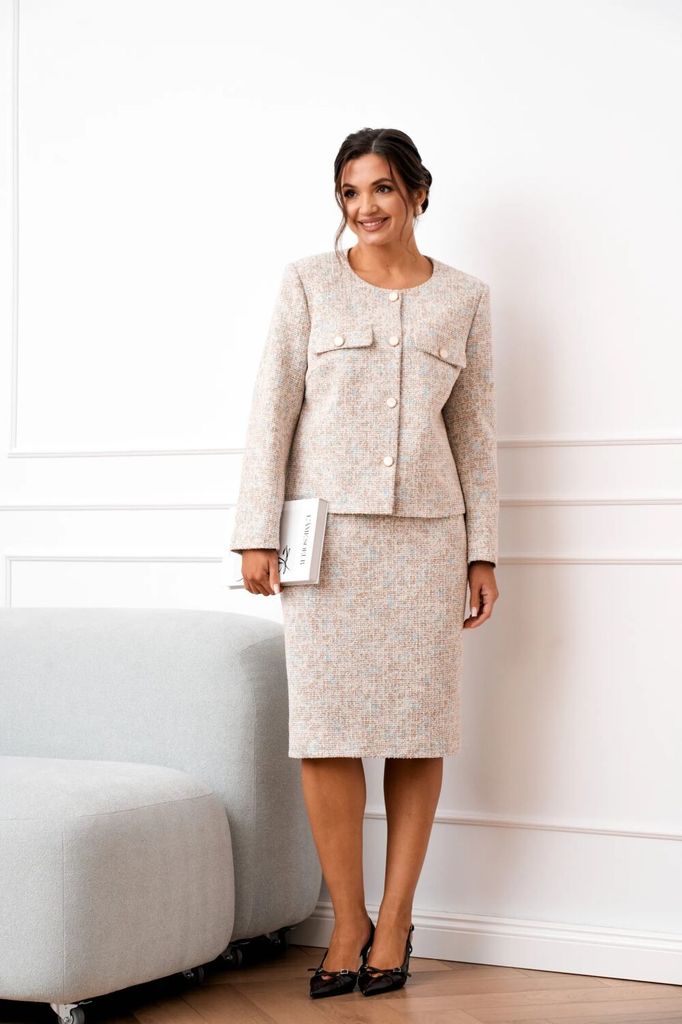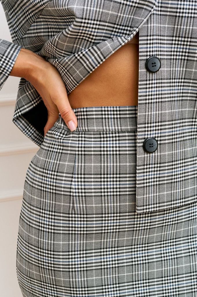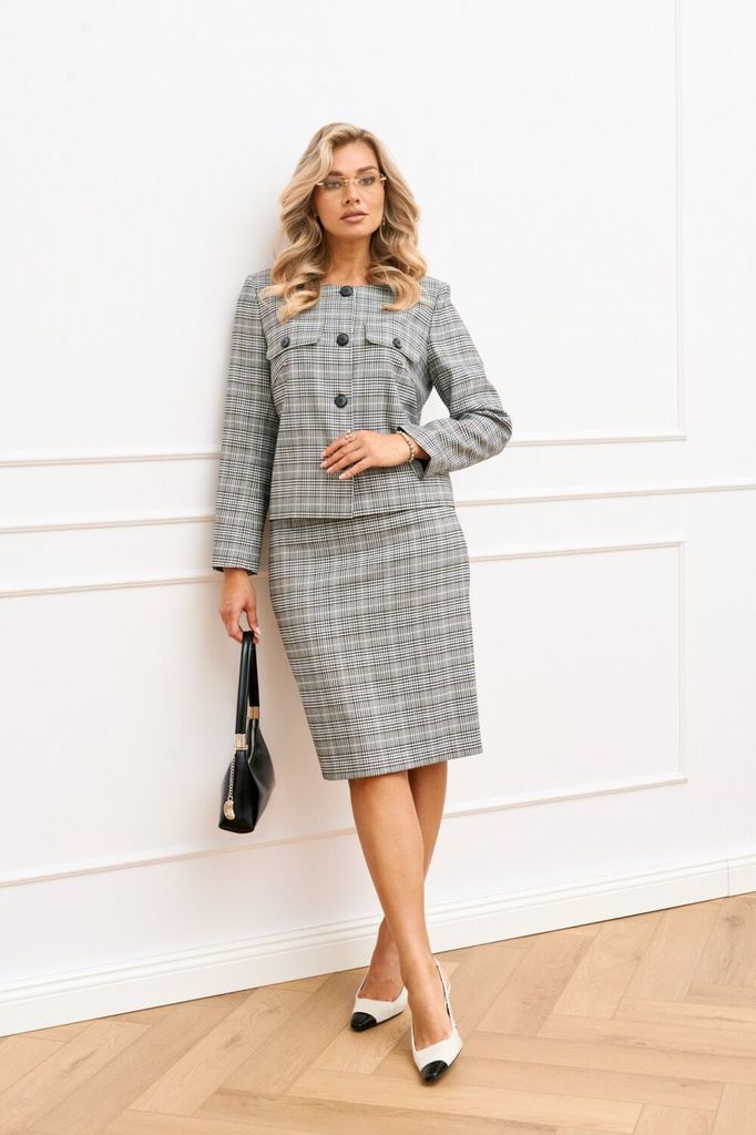 Состав: Вискоза-33%; ПЭ-64%; Эластан-3%; Комплект юбочный 2-х предметный, состоящий из жакета прямого силуэта на подкладке и классической юбки длинной ниже колена на подкладке. Жакет с круглой горлови... Показать описание ной и центральной застёжкой на петли и декоративные пуговицы. По полочке обработана нагрудная вытачка, в области груди настрочен клапан, закрепленный пуговицей. Спинка цельнокроеная. Рукав втачной, длинный. Юбка полуприлегающего силуэта, длиной до середины колена. В среднем шве заднего полотнища юбки обработана потайная молния, по низу шлица. Наименование измерений Размеры (см) Допустимые(см) отклонения +/- 46 48 50 52 54 56 Обхват груди 92 96 100 104 108 112 Обхват бедер 100 104 108 112 116 120 Рост 170 170 170 170 170 170 +/- 1см. Длина спинки 58 58 58 58 58 58 +/- 1см. Ширина спинки 40 40 40 44 44 44 +/- 1см. Ширина изделия на уровне глубины проймы 102 106 110 114 118 122 +/- 1см. Ширина плеча 12 12 12 12 12 12 +/- 1см. Ширина изделия по линии талии 100 104 108 112 116 120 +/- 1см. Ширина изделия в низу 108 112 116 120 124 128 +/- 1см Длина рукава 60 60 60 60 60 60 +/- 1см Ширина рукава в низу 28 28 28 31 31 31 +/- 1см Ширина рукава в верху 35 37 39 41 43 45 +/- 1см Юбка Наименование измерений Размеры (см) Допустимые(см) отклонения +/- 46 48 50 52 54 56 Обхват груди 92 96 100 104 108 112 Обхват талии 74 76 82 86 90 94 Обхват бедер 100 104 108 112 116 120 Рост 170 170 170 170 170 170 +/- 1см. Длина юбки по боковому шву 64 64 64 64 64 64 +/- 1см. Ширина юбки по линии бедер 104 108 112 116 120 124 +/- 1см. Ширина юбки по линии талии без учета резинки 78 82 86 90 94 98 +/- 1см. Ширина юбки по линии талии с учетом резинки 70 74 78 82 86 90 +/- 1см. Длина шлицы 23 23 23 23 23 23 +/- 1см. Ширина пояса 4 4 4 4 4 4 +/- 1см