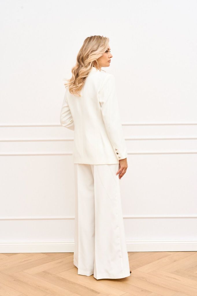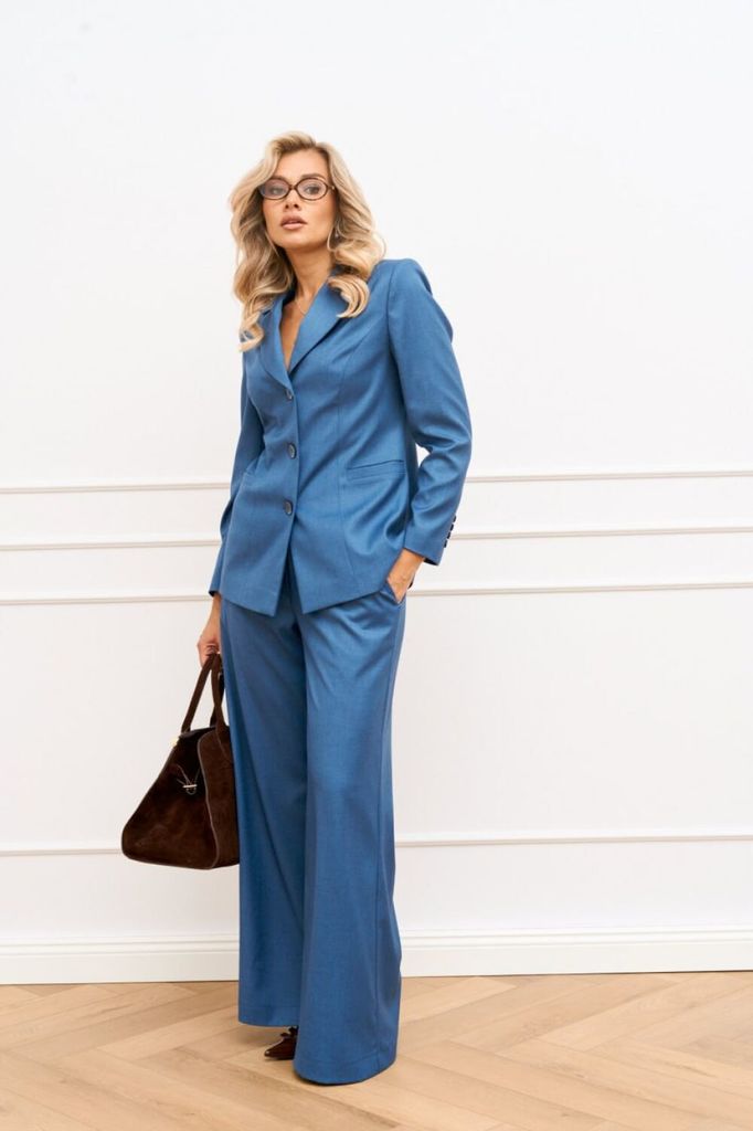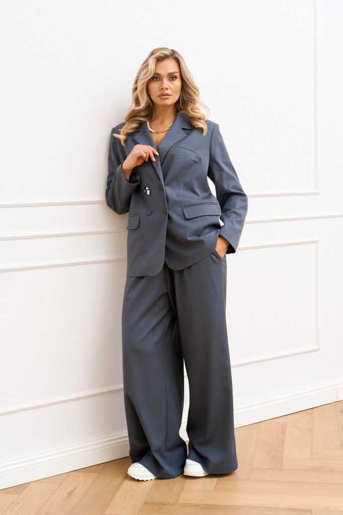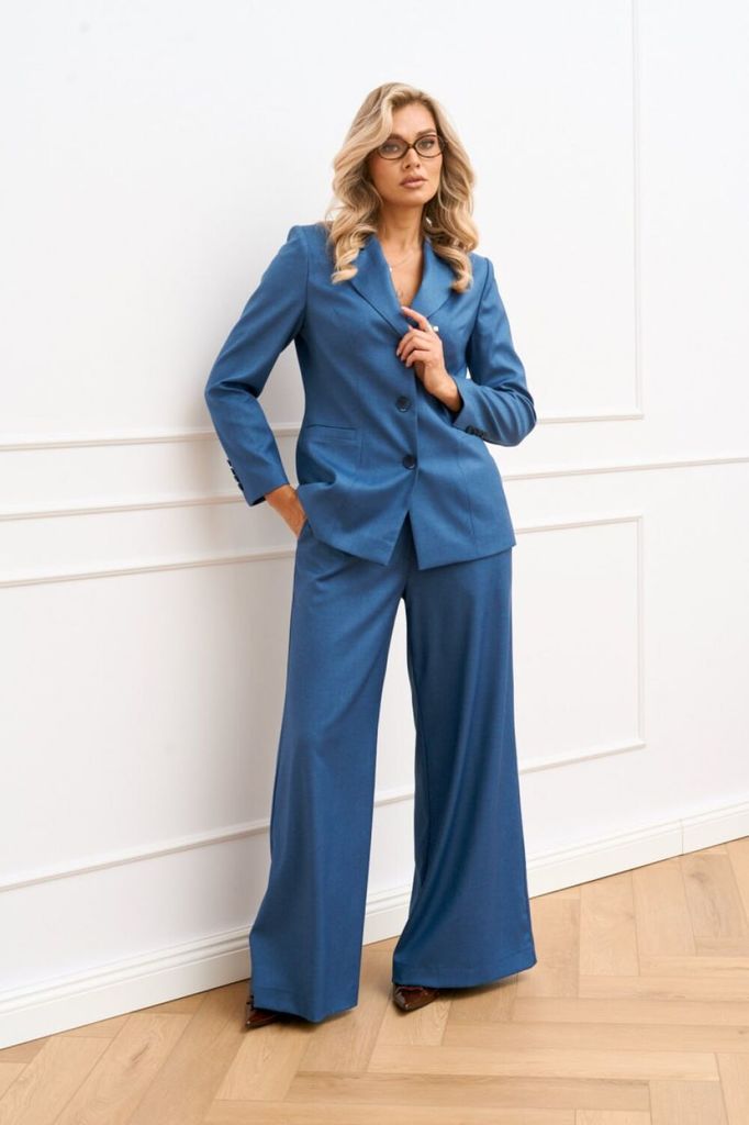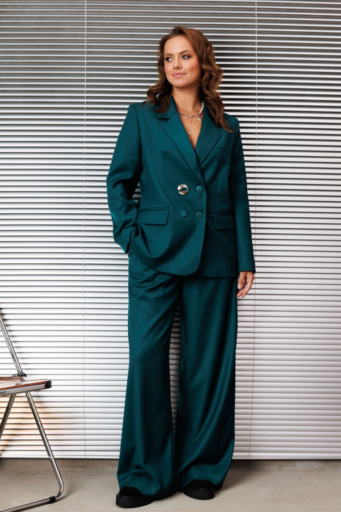 Состав: Вискоза-64%; ПЭ-33%; Спандекс-3%; Женский брючный костюм двойка состоящий из стильного жакета на подкладке современного прямого силуэта и брюк палаццо из костюмной ткани. Жакет двубортный, зас... Показать описание тёгивающийся на пуговицы и дополнен декоративной брошью. Воротник пиджачного типа с отложными лацканами. Спереди обработаны прорезные карманы в рамку с клапанами и нефункциональный карман листочка с левой стороны в области груди. Спинка со средним швом и отлетной шлицей по низу. Рукава втачные, двухшовные. Брюки палаццо, пояс притачной с эластичной тесьмой и шнурком. В боковых швах обработаны карманы с отрезным бочком Наименование измерений Размеры (см) Допустимые(см) отклонения +/- 46 48 50 52 54 56 Обхват груди 92 96 100 104 108 112 Обхват бедер 100 104 108 112 116 120 Рост 170 170 170 170 170 170 +/- 1см. Длина спинки 69 69 69 71 71 71 +/- 1см. Ширина спинки 40 40 40 44 44 44 +/- 1см. Ширина изделия на уровне глубины проймы 104 108 112 116 120 124 +/- 1см. Ширина плеча 14 14 14 14 14 14 +/- 1см. Ширина изделия по линии талии 100 104 108 112 116 120 +/- 1см. Ширина изделия в низу 108 112 116 120 124 128 +/- 1см Длина рукава 60 60 60 60 60 60 +/- 1см Ширина рукава в низу 28 28 28 30 30 30 +/- 1см Ширина рукава в верху 34 36 38 40 42 44 +/- 1см Брюки Наименование измерений Размеры (см) Допустимые(см) отклонения +/- 46 48 50 52 54 56 Обхват груди 92 96 100 104 108 112 Обхват талии 74 76 82 86 90 94 Обхват бедер 100 104 108 112 116 120 Рост 170 170 170 170 170 170 +/- 1см. Длина брюк по боковому шву 109 109 109 109 109 109 +/- 1см. Ширина брюк по линии бедер 114 118 122 126 130 134 +/- 1см. Ширина брюк по линии талии без учета резинки 94 98 102 106 110 114 +/- 1см. Ширина брюк по линии талии с учетом резинки 80 84 90 94 98 102 +/- 1см. Ширина брюк внизу изделия 66 68 70 72 74 76 +/- 1см. Ширина пояса 4 4 4 4 4 4 +/- 1см Ширина брюк на уровне колена 66 68 70 72 74 76 +/- 1см. Длина брюк по шаговому шву 82 82 82 82 82 82 +/- 1см.