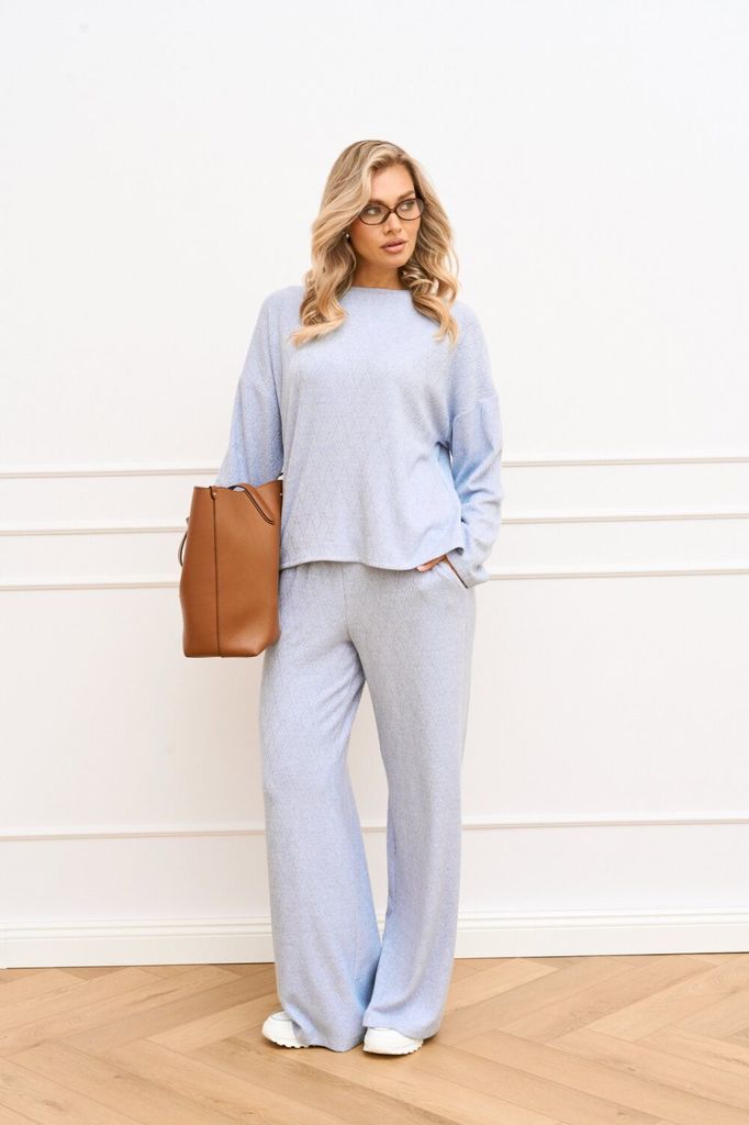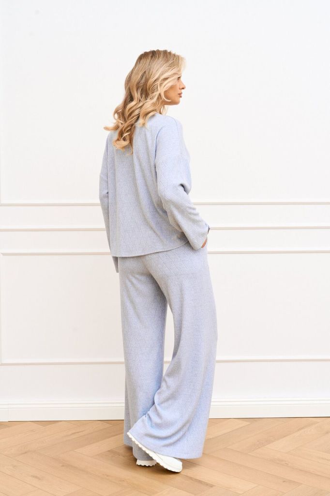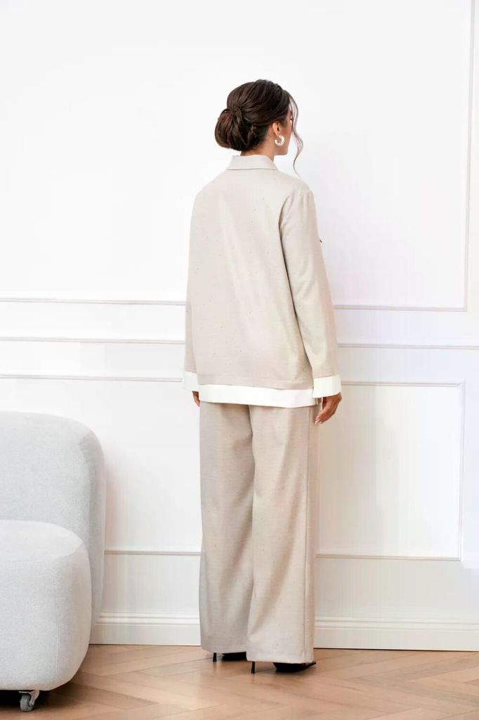 Состав: Вискоза-68%; ПЭ-28%; Спандекс-4%; Элегантный брючный костюм в нежном цвете – идеальное решение для создания комфортного и стильного образа. Комплект состоит из свободного джемпера с длинными р... Показать описание укавами и широких брюк на эластичном поясе, что обеспечивает оптимальный комфорт при носке. Мягкая ткань с легким рубчатым текстурным узором добавляет изделию утонченности. Джемпер с округлым вырезом горловины, линия плеча спущена, рукав втачной, длинный, в боковых швах разрезы. Брюки-палаццо свободного силуэта, верхний срез обработан притачным поясом на эластичной тесьме, по боковым швам карманы с отрезным бочком. Этот костюм идеально подходит для релаксации дома или создания непринужденного образа для выхода в свет Наименование измерений Размеры (см) Допустимые(см) отклонения +/- 46 48 50 52 54 56 Обхват груди 92 96 100 104 108 112 Обхват бедер 100 104 108 112 116 120 Рост 170 170 170 170 170 170 +/- 1см. Длина спинки 64 64 64 64 64 64 +/- 1см. Ширина изделия на уровне глубины проймы 112 116 120 124 128 132 +/- 1см. Ширина плеча 25 25 25 25 25 25 +/- 1см. Ширина изделия по линии талии 110 114 118 122 126 130 +/- 1см. Ширина изделия в низу 112 116 120 124 128 132 +/- 1см Длина рукава 49 49 49 49 49 49 +/- 1см Ширина рукава в низу 30 30 30 34 34 34 +/- 1см Ширина рукава в верху 42 44 46 48 50 52 +/- 1см