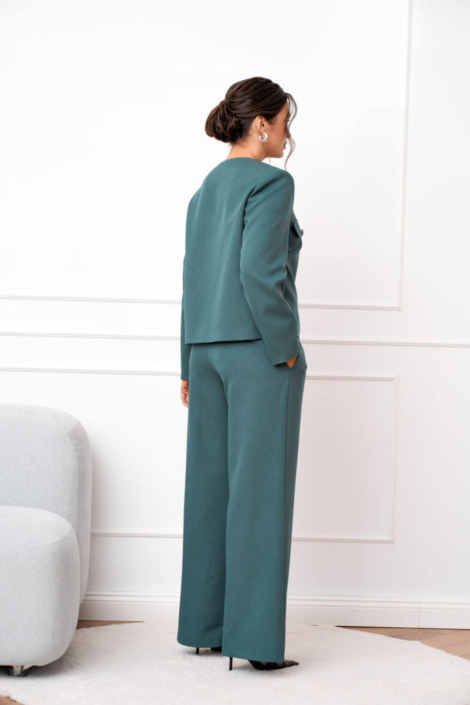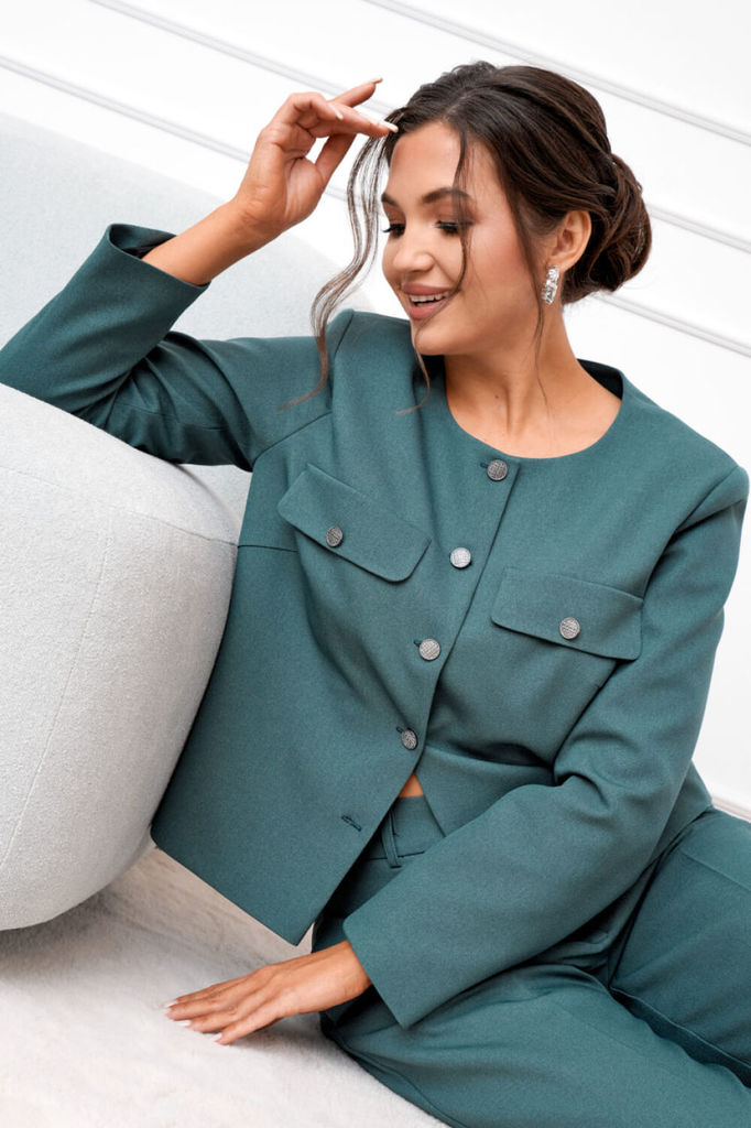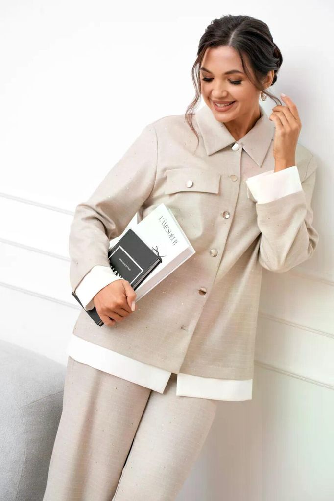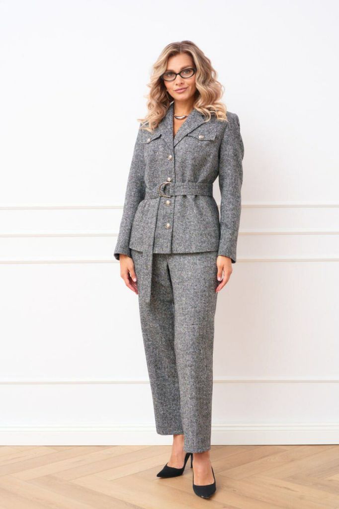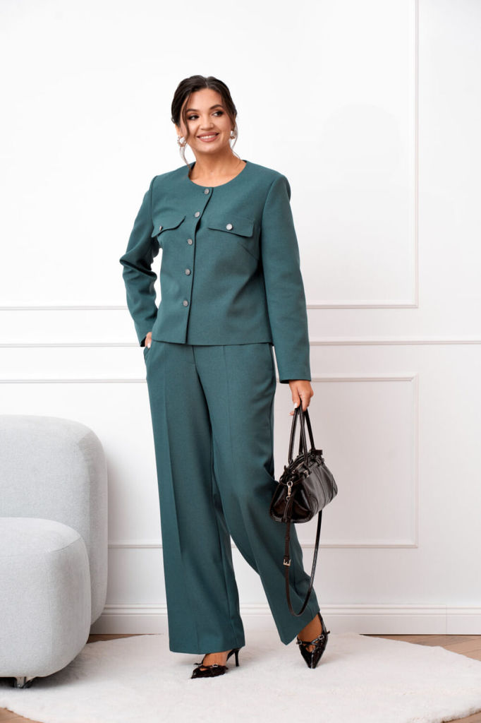 Состав: Вискоза-68%; ПЭ-28%; Спандекс-4%; Женский брючный костюм двойка, состоящий из жакета прямого силуэта без подкладки и прямых брюк. Жакет с круглым вырезом горловины с центральной застежкой, зас... Показать описание тегивающейся на петли и пуговицы. По полочкам обработана нагрудная выточка для лучшей посадки изделия, по низу полочки асимметричные. Спинка цельнокроеная. Рукава втачные, длинные по низу обработан цельнокроеный манжет. Брюки прямого кроя со средней посадкой. В боковых швах функциональные карманы с отрезным бочком. Верхний срез оформлен поясом с эластичной тесьмой Наименование измерений Размеры (см) Допустимые(см) отклонения +/- 48 50 52 54 56 Обхват груди 96 100 104 108 112 Обхват бедер 104 108 112 116 120 Рост 170 170 170 170 170 +/- 1см. Длина спинки 48 50 52 54 56 +/- 1см. Ширина спинки 96 100 104 108 112 +/- 1см. Ширина изделия на уровне глубины проймы 104 108 112 116 120 +/- 1см. Ширина плеча 170 170 170 170 170 +/- 1см. Ширина изделия по линии талии 71 71 71 71 71 +/- 1см. Ширина изделия в низу 42 42 45 45 45 +/- 1см Длина рукава 112 116 120 124 128 +/- 1см Ширина рукава в низу 13 13 13 13 13 +/- 1см Ширина рукава в верху 110 114 118 122 126 +/- 1см Брюки Наименование измерений Размеры (см) Допустимые(см) отклонения +/- 48 50 52 54 56 Обхват груди 96 100 104 108 112 Обхват талии 76 82 86 90 94 Обхват бедер 104 108 112 116 120 Рост 170 170 170 170 170 +/- 1см. Длина брюк по боковому шву 99 99 99 99 99 +/- 1см. Ширина брюк по линии бедер 108 112 116 120 124 +/- 1см. Ширина брюк по линии талии без учета резинки 92 96 100 104 108 +/- 1см. Ширина брюк по линии талии с учетом резинки 74 80 84 88 90 +/- 1см. Ширина брюк внизу изделия 42 44 46 48 50 +/- 1см. Ширина пояса 4 4 4 4 4 +/- 1см Ширина брюк на уровне колена 54 56 58 60 62 +/- 1см. Длина брюк по шаговому шву 75 75 75 75 75 +/- 1см.