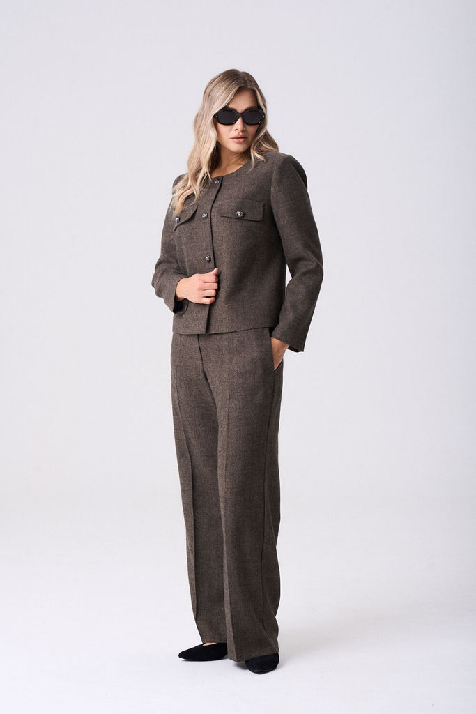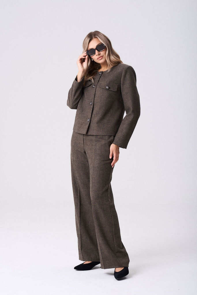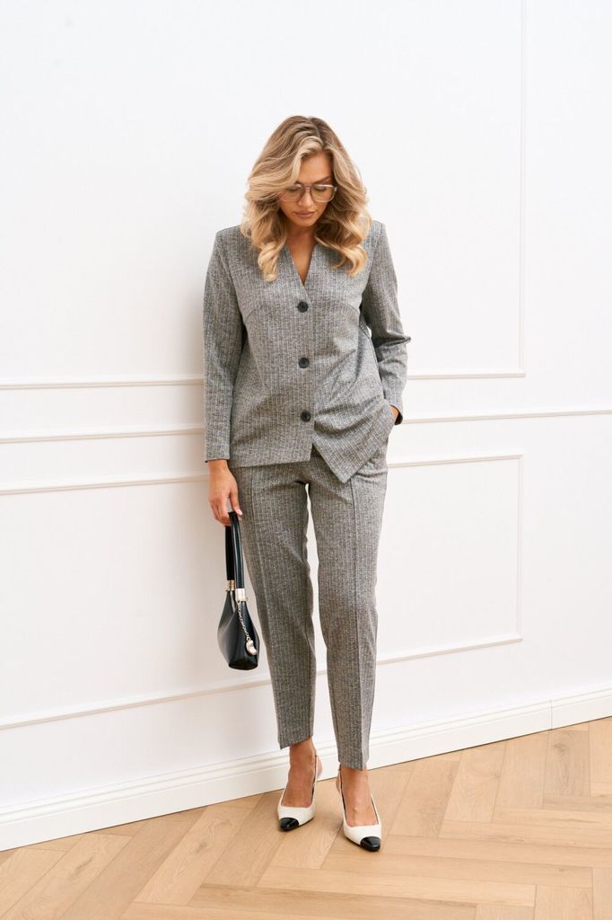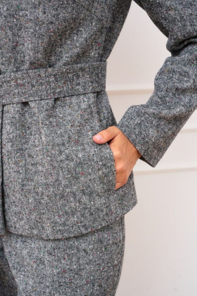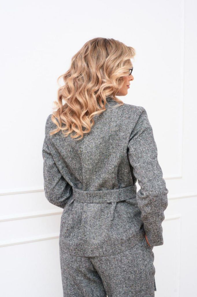 Состав: Вискоза-68%; ПЭ-28%; Спандекс-4%; Женский брючный костюм двойка, состоящий из жакета прямого силуэта без подкладки и прямых брюк. Жакет с круглым вырезом горловины с центральной застежкой, зас... Показать описание тегивающейся на петли и пуговицы. По полочкам обработана нагрудная выточка для лучшей посадки изделия, по низу полочки асимметричные. Спинка цельнокроеная. Рукава втачные, длинные по низу обработан цельнокроеный манжет. Брюки прямого кроя со средней посадкой. В боковых швах функциональные карманы с отрезным бочком. Верхний срез оформлен поясом с эластичной тесьмой Наименование измерений Размеры (см) Допустимые(см) отклонения +/- 48 50 52 54 56 Обхват груди 96 100 104 108 112 Обхват бедер 104 108 112 116 120 Рост 170 170 170 170 170 +/- 1см. Длина спинки 48 50 52 54 56 +/- 1см. Ширина спинки 96 100 104 108 112 +/- 1см. Ширина изделия на уровне глубины проймы 104 108 112 116 120 +/- 1см. Ширина плеча 170 170 170 170 170 +/- 1см. Ширина изделия по линии талии 71 71 71 71 71 +/- 1см. Ширина изделия в низу 42 42 45 45 45 +/- 1см Длина рукава 112 116 120 124 128 +/- 1см Ширина рукава в низу 13 13 13 13 13 +/- 1см Ширина рукава в верху 110 114 118 122 126 +/- 1см Брюки Наименование измерений Размеры (см) Допустимые(см) отклонения +/- 48 50 52 54 56 Обхват груди 96 100 104 108 112 Обхват талии 76 82 86 90 94 Обхват бедер 104 108 112 116 120 Рост 170 170 170 170 170 +/- 1см. Длина брюк по боковому шву 99 99 99 99 99 +/- 1см. Ширина брюк по линии бедер 108 112 116 120 124 +/- 1см. Ширина брюк по линии талии без учета резинки 92 96 100 104 108 +/- 1см. Ширина брюк по линии талии с учетом резинки 74 80 84 88 90 +/- 1см. Ширина брюк внизу изделия 42 44 46 48 50 +/- 1см. Ширина пояса 4 4 4 4 4 +/- 1см Ширина брюк на уровне колена 54 56 58 60 62 +/- 1см. Длина брюк по шаговому шву 75 75 75 75 75 +/- 1см.