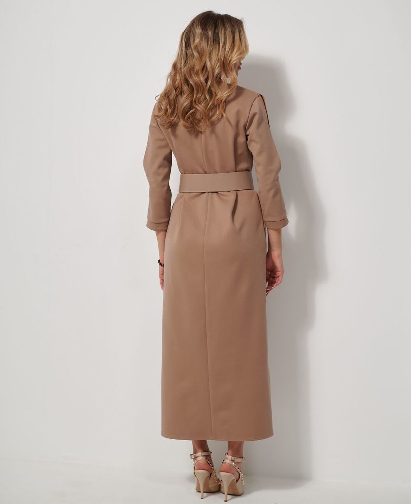 Платье женское полуприлегающего силуэта длинной за колено из легкой плательной ткани. Спинка платья цельнокроеная в области лопаток декоративные подрезы, так же обработаны талиевые выточки для лучшей ... Показать описание посадки изделия по фигуре. По полочке центральная застежка на цельнокроеных планках, застегивающихся на петли и пуговицы. Воротник – стойка. Рукава втачные, длинные по низу притачная манжета, застегивающаяся на петлю и пуговицу. Для удобства в боковых швах обработаны карманы. Платье дополнено съёмным поясом из основной ткани.