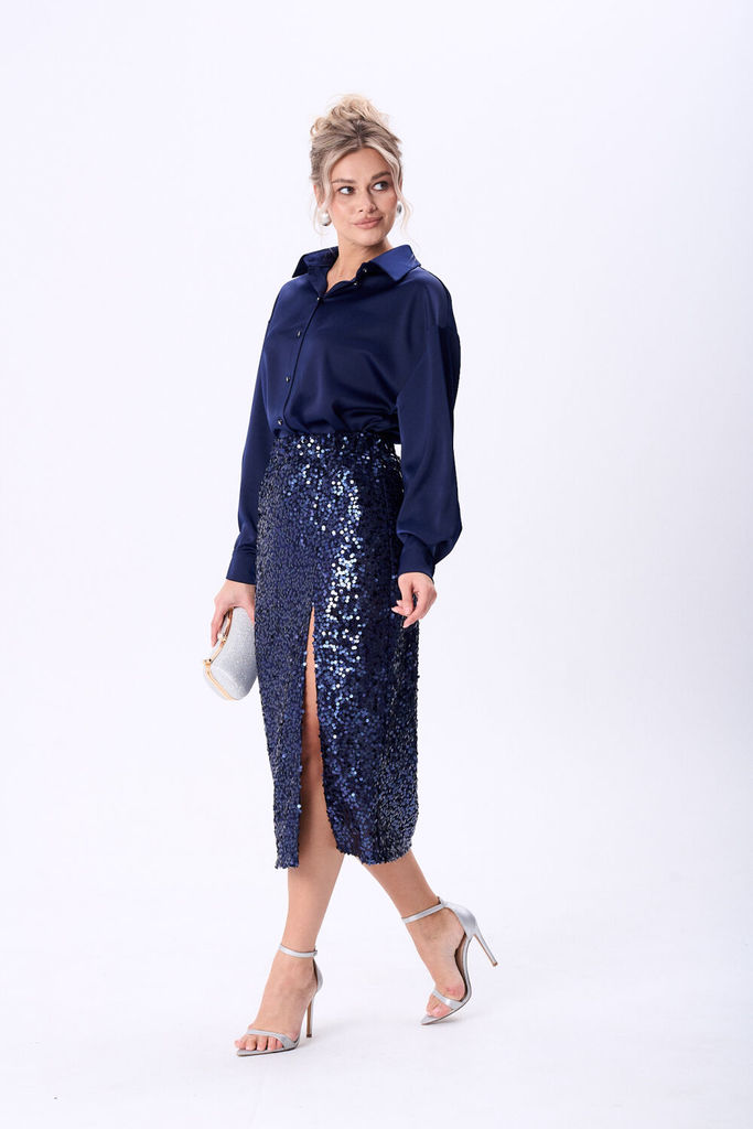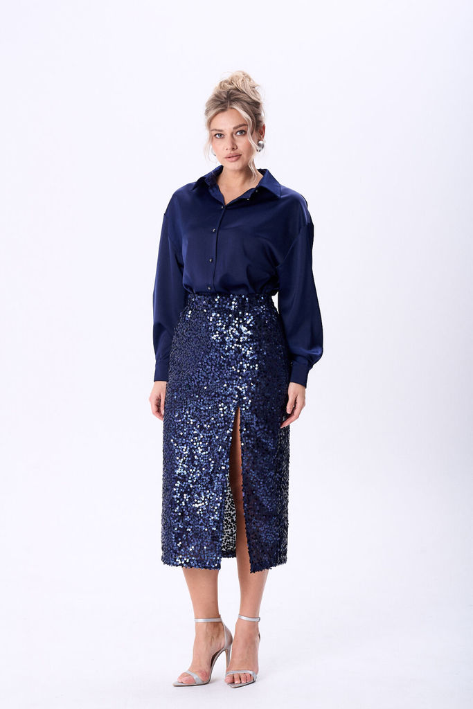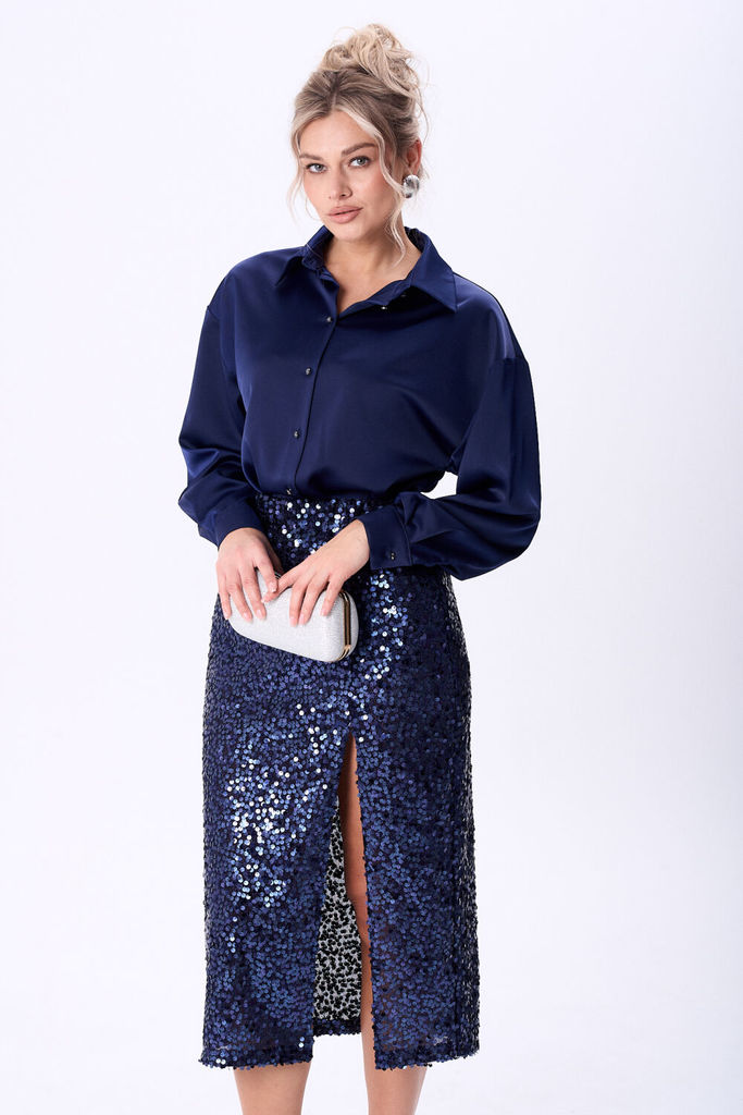 Состав: Блуза: Вискоза-62%; ПЭ-32%; Спандекс-6%; Юбка: ПЭ-100%; Костюм женский состоящий из юбки из сверкающей ткани в пайетки и блузки из сатина. Юбка прямого силуэта на подкладке длинной миди, на пе... Показать описание реднем полотнище обработан разрез. Верхний срез юбки обработан эластичной тесьмой что обеспечит комфортную посадку изделия