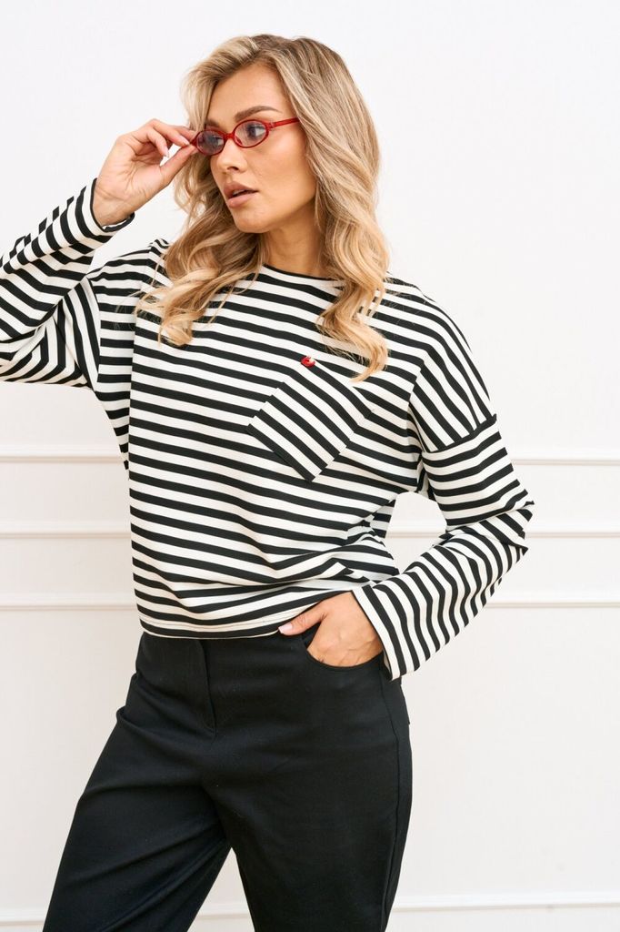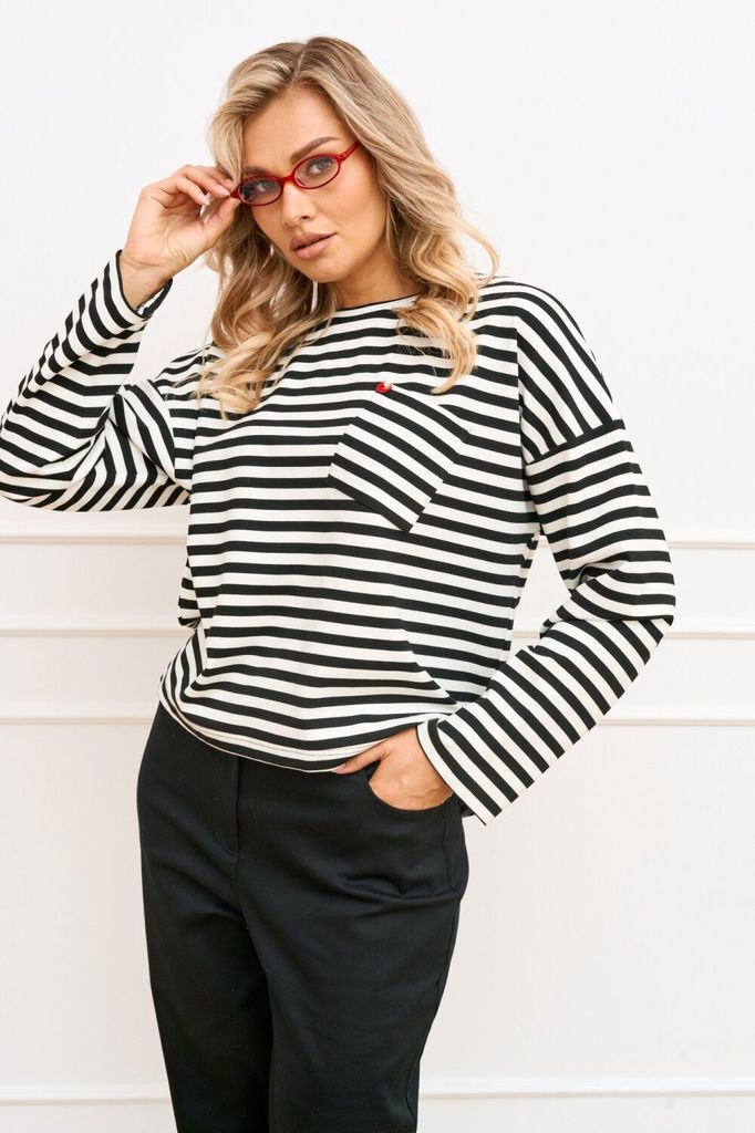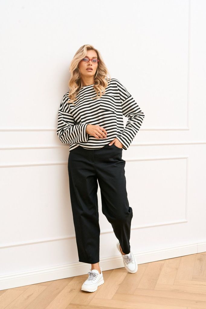 Состав: Вискоза-60%; ПЭ-35%; Спандекс-5%; Джемпер свободного силуэта из трикотажного полотна в полоску длиной ниже линии бедер. Линия плеча спущена, рукав длинный втачной одношовный. Вырез горловины к... Показать описание руглый обработан притачной бейкой. По полочке с левой стороны обработан накладной карман. Низ изделия асимметричный по спинка длиннее относительно переда. Наименование измерений Размеры (см) Допустимые(см) отклонения +/- 46 48 50 52 54 56 Обхват груди 92 96 100 104 108 112 Обхват бедер 100 104 108 112 116 120 Рост 170 170 170 170 170 170 +/- 1см. Длина спинки 63 63 63 63 63 63 +/- 1см. Ширина изделия на уровне глубины проймы 112 116 120 124 128 132 +/- 1см. Ширина плеча 25 25 25 25 25 25 +/- 1см. Ширина изделия по линии талии 110 114 118 122 126 130 +/- 1см. Ширина изделия в низу 112 116 120 124 128 132 +/- 1см Длина рукава 49 49 49 49 49 49 +/- 1см Ширина рукава в низу 30 30 30 34 34 34 +/- 1см Ширина рукава в верху 42 44 46 48 50 52 +/- 1см