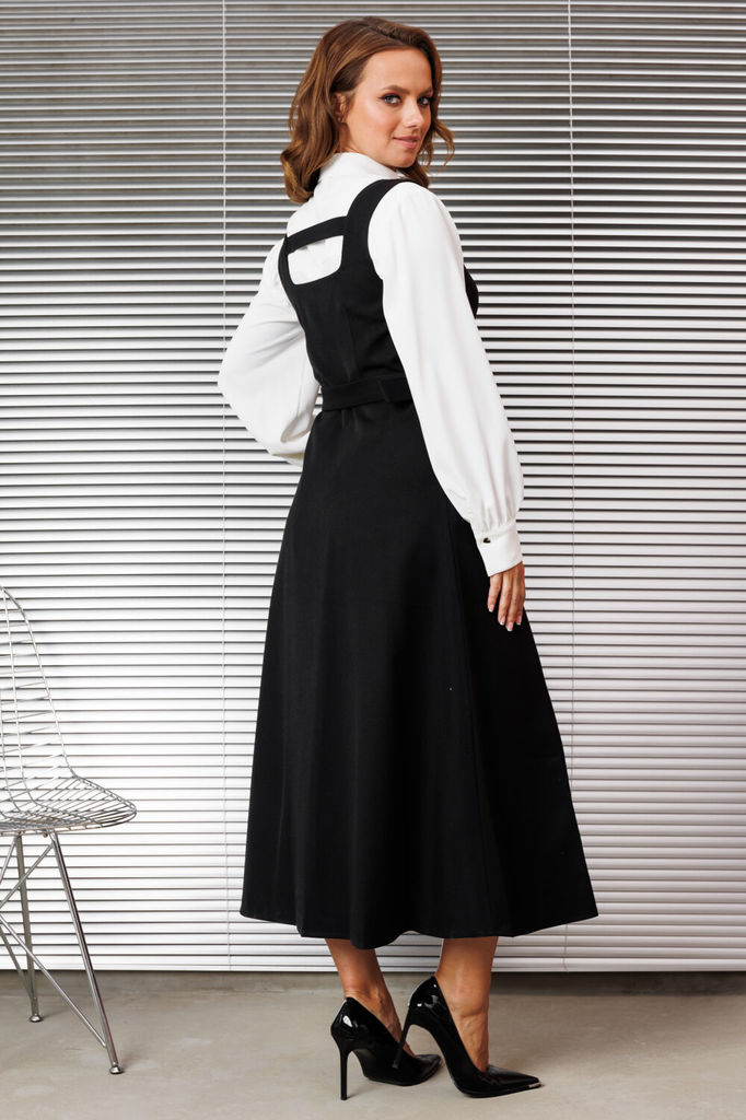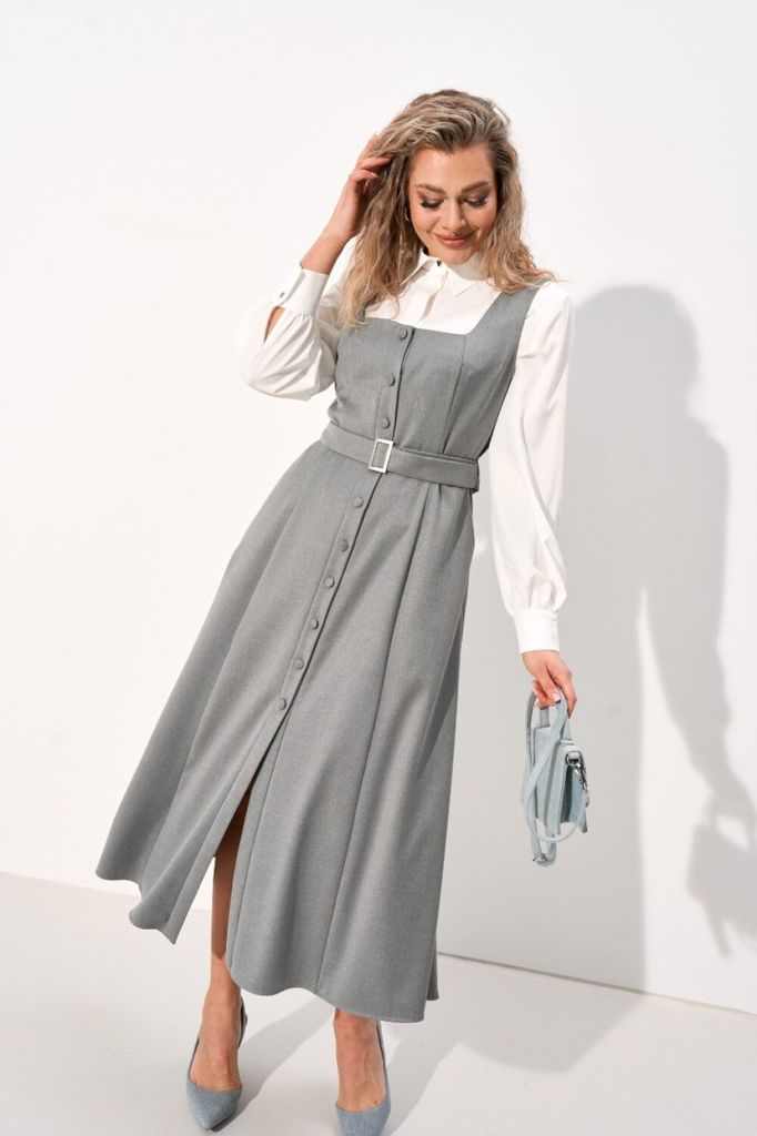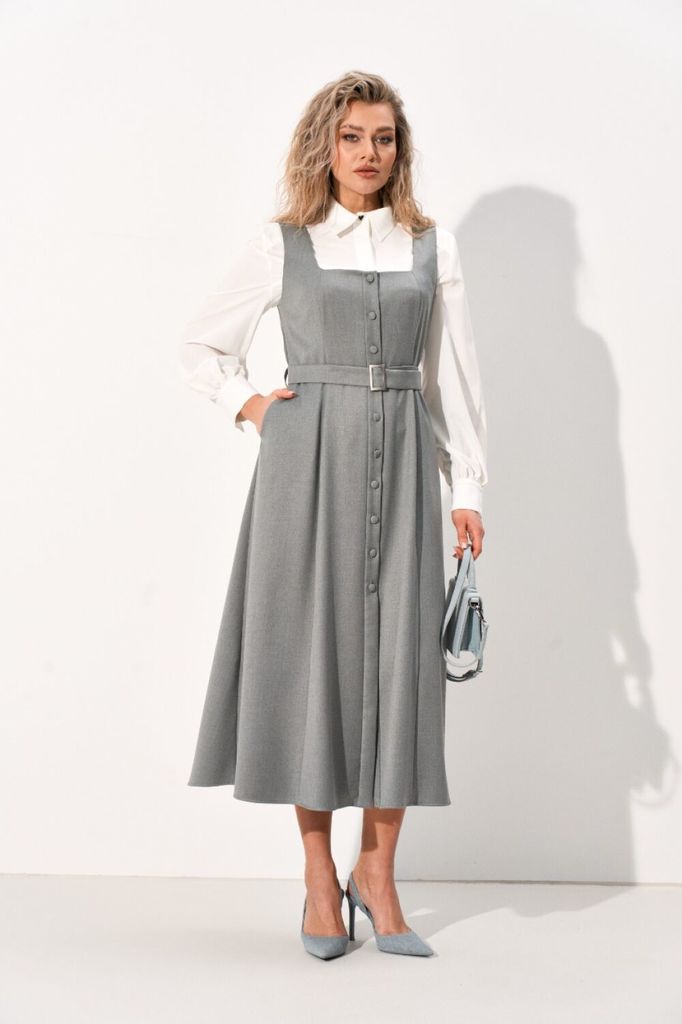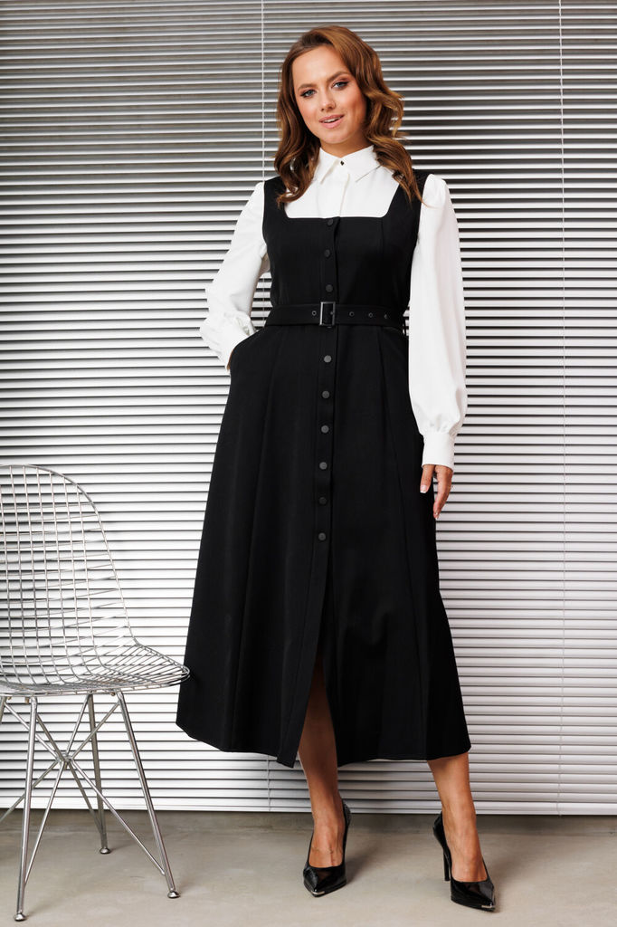 Женский комплект состоящий из сарафана и блузки. Сарафан из костюмной ткани, отрезной по линии талии, юбка имеет А-силуэт благодаря чему выгодно подчёркивает фигуру. По полочке и спинке обработаны рел... Показать описание ьефы, которые зрительно вытягивают фигуру. Вырез круглый, по спинке вырез дополнен перемычкой, бретели цельнокроеные. Застёжка центральная на притачных планках застегивающаяся на пробивные кнопки. По юбке полочки в области талии обработан карман с отрезным бочком. Сарафан дополнен съемным поясом из основной ткани застегивающийся на пряжку, который фиксируется шлевками по боковым швам. Блузка прямого силуэта идеально сочетает в себе комфорт и стиль. В блузке классический рубашечный воротник и удобная центральная застежка на потайной планке на петли и пуговицы. Рукава втачные со сборкой по низу что обеспечивает эффектный объемный вид, по низу обработан притачной манжет застегивающийся на петлю и пуговицу. По полочке в области груди подрез. По спинке кокетка, переходящая на полочку и бантовая складка от кокетки. В боковых швах по низу обработаны разрезы