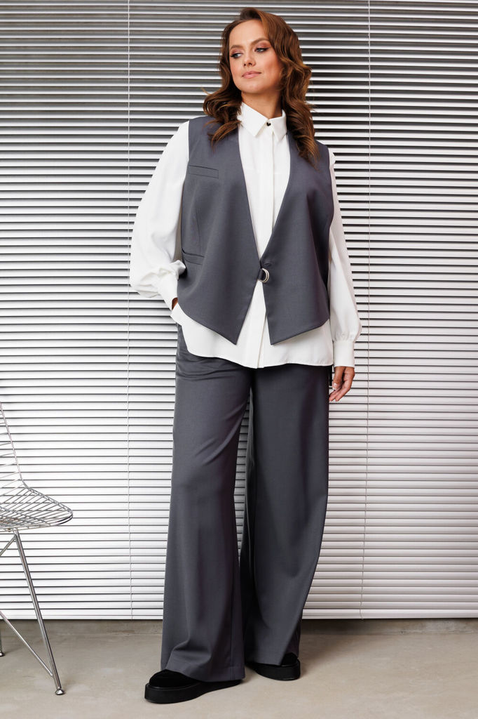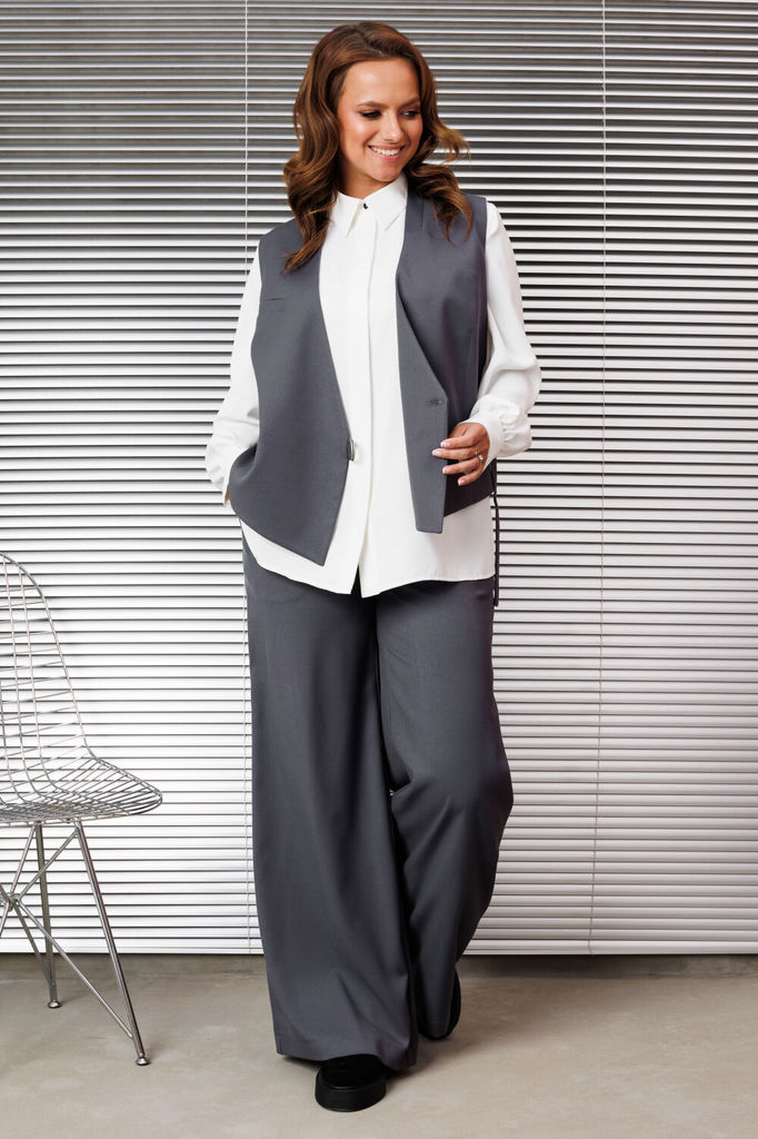 Женский брючный костюм тройка, состоящий из жилета, брюк и рубашки. Изысканный жилет полуприлегающего силуэта, он полностью на подкладке, что обеспечивает идеальную посадку и комфорт, дополнен застеж... Показать описание кой на декоративную тесьму и потайную пуговицу. На правой полочке обработан нагрудный карман листочка и функциональный карман листочка в области талии, по горловине прилегающий воротник стойка. Спинка со средним швом и выточками. Брюки свободного прямого кроя со средней посадкой. В боковых швах функциональные карманы с отрезным бочком. Верхний срез оформлен поясом с эластичной тесьмой. Блузка прямого силуэта идеально сочетает в себе комфорт и стиль. В блузке классический рубашечный воротник и удобная центральная застежка на потайной планке на петли и пуговицы. Рукава втачные со сборкой по низу что обеспечивает эффектный объемный вид, по низу обработан притачной манжет застегивающийся на петлю и пуговицу. По полочке в области груди подрез. По спинке кокетка, переходящая на полочку и бантовая складка от кокетки. В боковых швах по низу обработаны разрезы