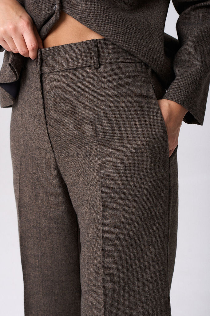 Состав: Вискоза-15%; ПЭ-70%; Шерсть-15%; Костюм женский из костюмной ткани состоящий из жакета полуприлегающего силуэта на подкладки и брюк классического прямого кроя. Жакет с круглой горловиной и цен... Показать описание тральной застёжкой на петли и декоративные пуговицы. По полочке обработана нагрудная вытачка, в области груди настрочен клапан, закрепленный пуговицей. Спинка цельнокроеная. Рукав втачной двухшовный, длинный. Брюки прямого силуэта в боковых швах обработаны карманы. Верхний срез обработан притачным поясом со шлёвками для ремня, по задним половинкам для лучшей посадки вставлена резинка, застегивающийся на петлю и пуговицу, застёжка центральна с гульфиком и откоском на тесьму молнию. Наименование измерений Размеры (см) Допустимые(см) отклонения +/- 46 48 50 52 54 56 Обхват груди 92 96 100 104 108 112 Обхват бедер 100 104 108 112 116 120 Рост 170 170 170 170 170 170 +/- 1см. Длина спинки 56 56 56 56 56 56 +/- 1см. Ширина спинки 43 43 43 46 46 46 +/- 1см. Ширина изделия на уровне глубины проймы 106 110 114 118 122 126 +/- 1см. Ширина изделия на уровне линии талии 104 108 112 116 120 124 +/- 1см. Ширина изделия в низу 110 114 118 122 126 130 +/- 1см Длина рукава 61 61 61 61 61 61 +/- 1см Ширина рукава в низу 27 27 27 30 30 30 +/- 1см Ширина рукава в верху 35 37 39 41 43 45 +/- 1см Ширина плеча 12 12 12 12 12 12 +/- 1см Брюки Наименование измерений Размеры (см) Допустимые(см) отклонения +/- 46 48 50 52 54 56 Обхват груди 92 96 100 104 108 112 Обхват талии 74 76 82 86 90 94 Обхват бедер 100 104 108 112 116 120 Рост 170 170 170 170 170 170 +/- 1см. Длина брюк по боковому шву 111 111 111 111 111 111 +/- 1см. Ширина брюк по линии бедер 104 108 112 116 120 124 +/- 1см. Ширина брюк по линии талии без учета резинки 82 86 90 94 98 102 +/- 1см. Ширина брюк по линии талии с учетом резинки 70 74 78 82 86 90 +/- 1см. Ширина брюк внизу изделия 58 60 62 64 66 68 +/- 1см. Ширина пояса 5 5 5 5 5 5 +/- 1см Ширина брюк на уровне колена 60 62 64 68 70 72 +/- 1см. Длина брюк по шаговому шву 82 82 82 82 82 82 +/- 1см.