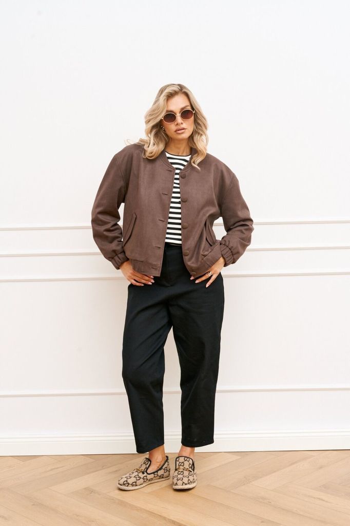 Состав: Вискоза-60%; ПЭ-35%; Эластан-5%; Бомбер женский свободного силуэта на подкладке выполнен из мягкого, приятного в носке замша. Застежка центральная на петли и пуговицы в тон ткани, по горловине... Показать описание воротник-стойка. По полочкам обработан функциональный карман листочка с клапаном. Линя плеча чуть спущена, рукав втачной, низ рукава обработан притачной манжетой с эластичной тесьмой. По низу изделия притачной пояс с эластичной тесьмой для лучшей посадки по фигуре Наименование измерений Размеры (см) Допустимые(см) отклонения +/- 44 46 48 50 52 54 Обхват груди 88 92 96 100 104 108 Обхват бедер 96 100 104 108 112 116 Рост 170 170 170 170 170 170 +/- 1см. Длина спинки 50 50 50 60 60 60 +/- 1см. Ширина спинки 48 48 48 51 51 51 +/- 1см. Ширина изделия на уровне глубины проймы 106 110 114 118 120 124 +/- 1см. Ширина изделия по линии талии 100 104 108 112 116 120 +/- 1см. Ширина изделия в низу 94/100 98/104 102/108 106/112 110/116 114/120 +/- 1см Длина рукава 57 57 57 57 57 57 +/- 1см. Ширина рукава в веху 34 36 38 42 44 46 +/- 1см. Ширина рукава в низу 20/24 20/24 20/ 24 22/ 26 22/ 26 22/ 26 +/- 1см.