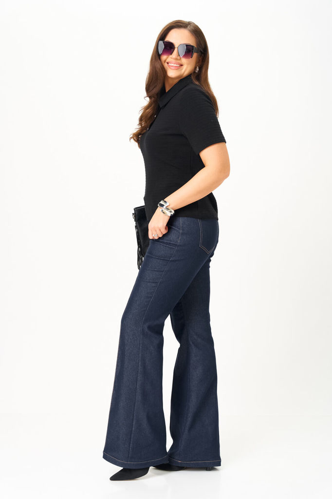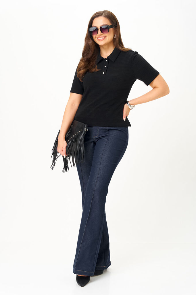 Состав: Спандекс-3%; Хлопок-97%; Элегантные джинсовые брюки из мягкого эластичного джинса расклешённые от колена, с контрастными отделочными строчками, которые придают изделию изысканность и индивидуа... Показать описание льность. Центральная застёжка на молнию и петлю и пуговицу. По передним половинкам обработан боковой фигурный карман, по задним настрочены накладные карманы. Верхний срез брюк обработан притачным поясом с шлёвками для ремня, для идеальной посадки по спинке вставлена эластичная тесьма. Наименование измерений Размеры (см) Допустимые(см) отклонения +/- 46 48 50 52 Обхват груди 92 96 100 104 Обхват талии 74 76 82 86 Обхват бедер 100 104 108 112 Рост 170 170 170 170 Длина брюк по боковому шву 112 112 112 112 +/- 1см. Ширина брюк по линии бедер 102 106 110 114 +/- 1см. Ширина брюк по линии талии без учета резинки 82 86 90 94 +/- 1см. Ширина брюк по линии талии с учетом резинки 64 68 72 76 +/- 1см. Ширина брюк внизу изделия 58 60 62 64 +/- 1см. Ширина пояса 4 4 4 4 +/- 1см Ширина брюк на уровне колена 44 46 48 50 +/- 1см. Длина брюк по шаговому шву 88 88 88 88 +/- 1см.