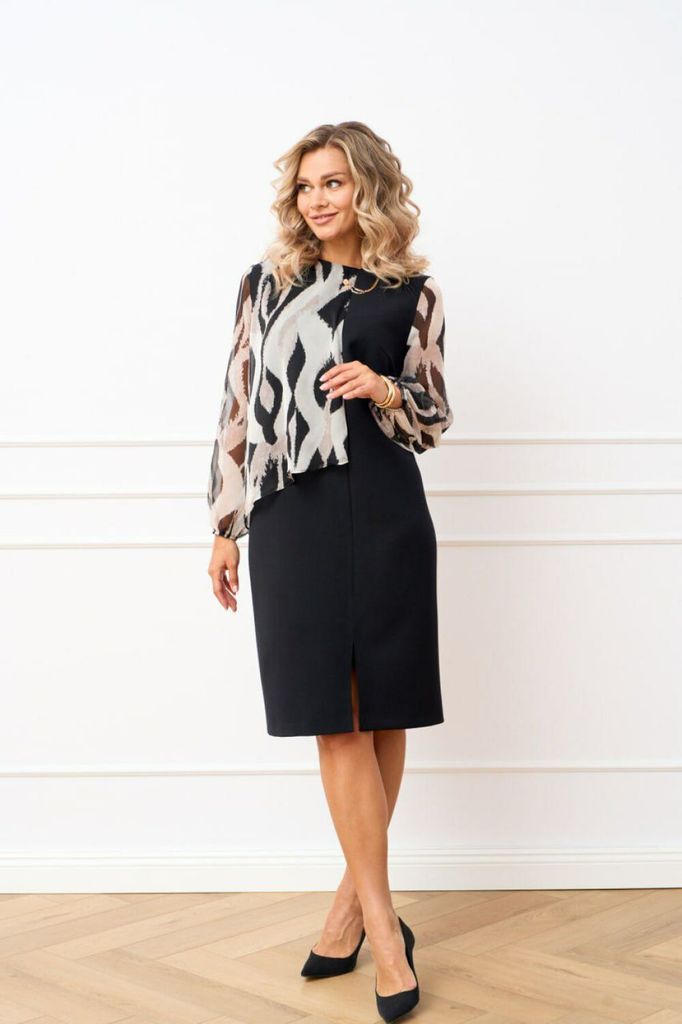 Состав: Платье: Вискоза-21%; ПЭ-73%; Спандекс-6%; Платье: ПЭ-100%; Платье комбинированное из шифона и костюмно-плательной ткани полуприлегающего силуэта. По полочке обработаны нагрудные выточки, также... Показать описание вставлена декоративная деталь из шифона по правое стороне входящая в подрез, который переходит на левую сторону по низу обработан разрез. Спинка со средним швом в котором обработана застежка на потайную тесьму молнию. Вырез горловины фигурный. Рукава длинные втачные из шифона по низу собраны на эластичную тесьму. Наименование измерений Размеры (см) Допустимые(см) отклонения +/- 50 52 54 56 58 60 Обхват груди 100 104 108 112 116 120 Обхват бедер 108 112 116 120 124 128 Рост 170 170 170 170 170 170 +/- 1см. Длина спинки 103 103 103 103 103 103 +/- 1см. Ширина спинки 39 39 39 42 42 42 +/- 1см. Ширина изделия на уровне глубины проймы 108 112 116 120 124 128 +/- 1см. Ширина изделия на уровне линии бёдер 112 116 120 124 128 132 +/- 1см. Ширина изделия по линии талии 104 108 112 116 120 124 +/- 1см. Ширина изделия в низу 99 103 107 111 115 119 +/- 1см Длина рукава 61 61 61 61 61 61 +/- 1см Ширина рукава в низу с учетом резинки 20 20 20 24 24 24 +/- 1см Ширина рукава в верху 38 40 42 44 46 48 +/- 1см Ширина плеча 12 12 12 12 12 12 +/-1см