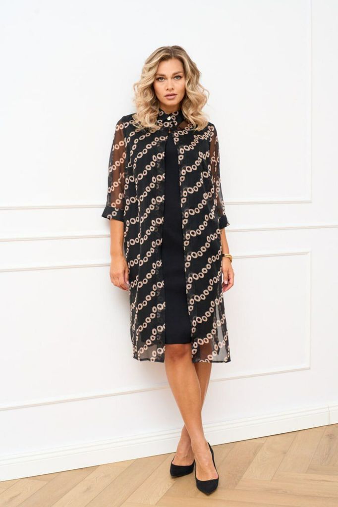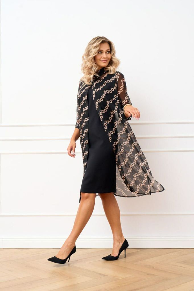 Состав: Платье: Вискоза-21%; ПЭ-73%; Спандекс-6%; Накидка: ПЭ-100%; Комплект двух предметный состоящий из платья и накидки-рубашки. Платье полуприлегающего силуэта из плательно-костюмной ткани без рук... Показать описание авов, по полочке обработаны талиевые и нагрудные выточки, вырез горловины фигурный. Спинка со средним швом, в котором обработана застёжка на потайную тесьму молнию по низу обработан разрез, также обработаны талиевые выточки. Накидка-рубашка прямого силуэта выполнена из шифона. Воротник рубашечный, застёжка центральная на одну петлю и пуговицу по стойке. В боковых швах обработаны разрезы. Рукав втачной длинной ?, по низу притачная манжета, застёгивающаяся на петлю и пуговицу. Накидка Наименование измерений Размеры (см) Допустимые(см) отклонения +/- 50 52 54 56 58 60 Обхват груди 100 104 108 112 116 120 Обхват бедер 108 112 116 120 124 128 Рост 170 170 170 170 170 170 +/- 1см. Длина спинки 107 107 107 107 107 107 +/- 1см. Ширина спинки 41 41 41 44 44 44 +/- 1см. Ширина изделия на уровне глубины проймы 110 114 118 122 126 130 +/- 1см. Ширина плеча 12 12 12 12 12 12 +/- 1см. Ширина изделия по линии талии 106 110 114 118 122 126 +/- 1см. Ширина изделия в низу 116 120 124 128 132 136 +/- 1см Длина рукава 45 45 45 45 45 45 +/- 1см Ширина рукава в верху 39 41 43 45 47 49 +/- 1см Ширина рукава в внизу 33 33 33 36 36 36 +/- 1см Ширина изделия на уровне линии бёдер 116 120 124 128 132 136 +/- 1см Платье Наименование измерений Размеры (см) Допустимые(см) отклонения +/- 50 52 54 56 58 60 Обхват груди 100 104 108 112 116 120 Обхват бедер 108 112 116 120 124 128 Рост 170 170 170 170 170 170 +/- 1см. Длина спинки 100 100 100 100 100 100 +/- 1см. Ширина спинки 37 37 37 40 40 40 +/- 1см. Ширина изделия на уровне глубины проймы 96 110 114 118 122 126 +/- 1см. Ширина изделия на уровне линии бёдер 112 116 120 124 128 132 +/- 1см. Ширина изделия по линии талии 94 98 102 106 110 114 +/- 1см. Ширина изделия в низу 98 102 106 110 114 118 +/- 1см Ширина плеча 9 9 9 9 9 9 +/- 1см