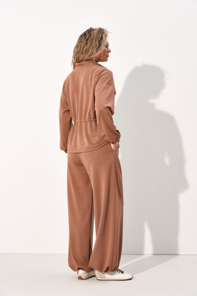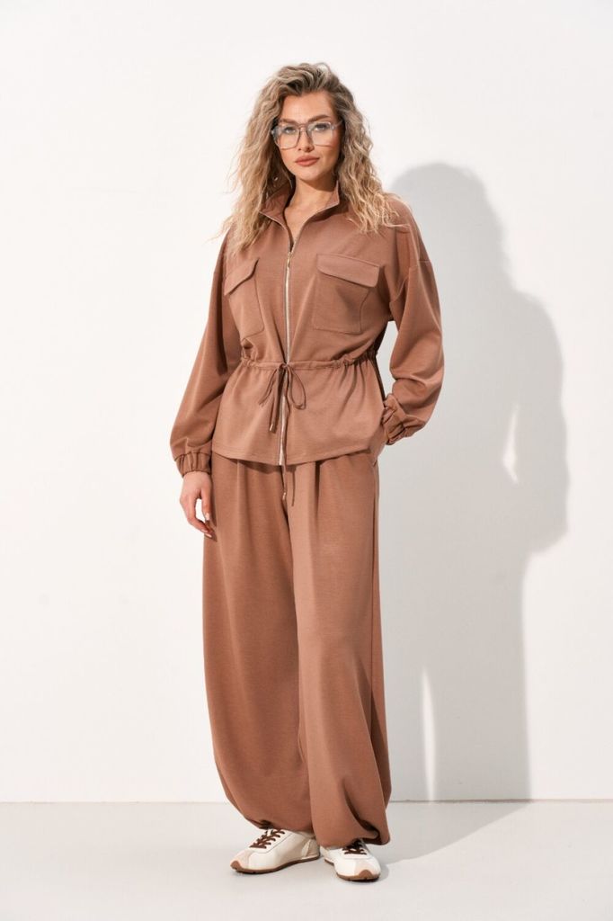 Состав: Вискоза-47%; ПЭ-64%; Спандекс-7%; Костюм женский спортивный выполнен из нежного трикотажного полотна что обеспечит максимально комфортную посадку по фигуре. Костюм состоит из джемпера полуприл... Показать описание егающего силуэта и брюк прямого кроя. Джемпер с центральной застёжкой на тесьму-молнию, воротник-стойка, по полочке в области груди настрочены накладные карманы с клапаном, по талии обработана кулиса, что позволяет регулировать посадку джемпера по фигуре. Рукав втачной, линия плеча чуть спущена по низу притачная манжета с эластичной тесьмой. Брюки прямого кроя, верхний срез брюк на притачном поясе с эластичной тесьмой благодаря чему брюки садятся на любую фигуру. В боковых швах обработан карман с отрезным бочком. По низу брюк вставлена эластичная тесьма с фиксатором, что позволит формировать силуэт брюк. Наименование измерений Размеры (см) Допустимые(см) отклонения +/- 46 48 50 52 54 Обхват груди 92 96 100 104 108 Обхват бедер 100 104 108 112 116 Обхват талии 74 76 82 86 90 Рост 170 170 170 170 170 Длина спинки 60 60 60 60 60 +/- 1см. Ширина спинки 58 58 58 61 61 +/- 1см. Ширина изделия на уровне глубины проймы 112 116 120 124 128 +/- 1см. Ширина изделия на уровне линии талии 102 106 110 114 118 +/- 1см. Ширина изделия в низу 120 124 128 132 136 +/- 1см Длина рукава 49 49 49 49 49 +/- 1см Ширина рукава в низу 21 21 21 24 24 +/- 1см Ширина рукава в верху 42 44 46 48 50 +/- 1см Ширина плеча 25 25 25 25 25 +/- 1см Брюки Наименование измерений Размеры (см) Допустимые(см) отклонения +/- 46 48 50 52 54 Обхват груди 92 96 100 104 108 Обхват талии 74 76 82 86 90 Обхват бедер 100 104 108 112 116 Рост 170 170 170 170 170 +/- 1см. Длина брюк по боковому шву 113 113 113 113 113 +/- 1см. Ширина брюк по линии бедер 116 120 124 128 132 +/- 1см. Ширина брюк по линии талии без учета резинки 90 94 98 102 106 +/- 1см. Ширина брюк по линии талии с учетом резинки 86 72 76 80 84 +/- 1см. Ширина брюк внизу изделия 70 72 74 76 78 +/- 1см. Ширина пояса 4 4 4 4 4 +/- 1см Ширина брюк на уровне колена 70 72 74 76 78 +/- 1см. Длина брюк по шаговому шву 85 85 85 85 85 +/- 1см.