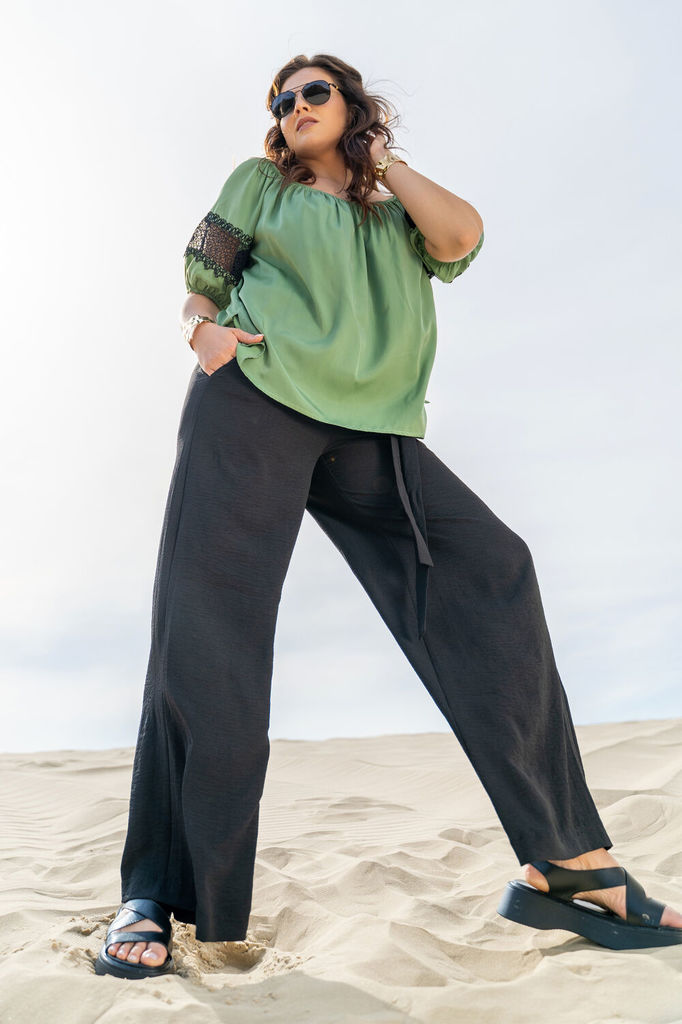Состав: Вискоза-68%; ПЭ-30%; Спандекс-2%; Джинсы палаццо — идеальный выбор для тех, кто ценит стиль и комфорт. Модель выполнена в трендовом стиле с широкими штанинами, что придаёт ей модный и расслабл... Показать описаниеенный вид. Джинсы палаццо с защипами и складками спереди, с боковыми карманами, идеально подходят для создания повседневных образов. Брюки отличаются свободным кроем, что в сочетании с резинкой по поясу добавляет комфорта при носке, а также делает их подходящими для любого типа фигуры. Добавьте эти стильные и универсальные брюки в свой гардероб, чтобы легко создавать модные образы на каждый день! Таблица измерений изделия в готовом виде М 2021 Наименование измерений/размер 50 52 54 56 58 60 Ширина по линии талии (в растянутом виде) 39 (46) 41 (48) 43 (50) 45 (52) 47 (54) 49 (56) Ширина по линии бёдер 60 62 64 66 68 70 Длина 113 113 113 113 113 113 Допустимые отклонения +-1-1,5 см