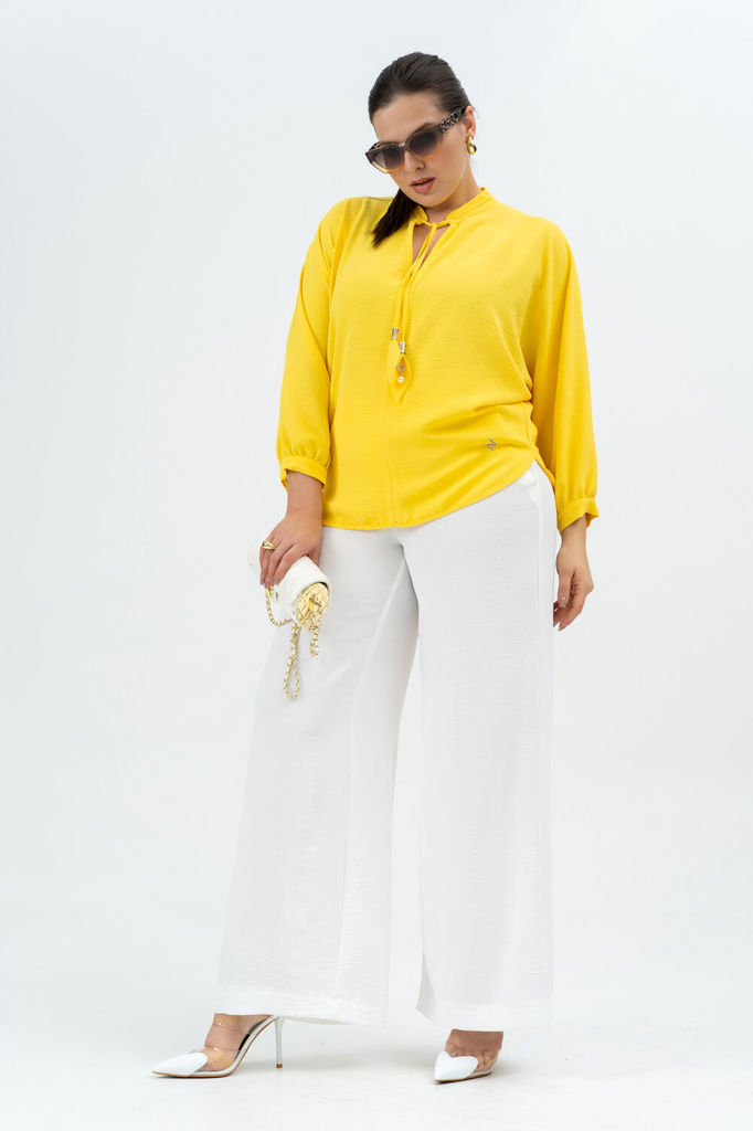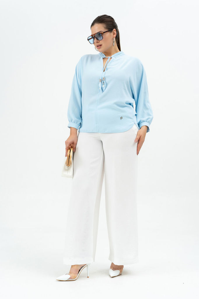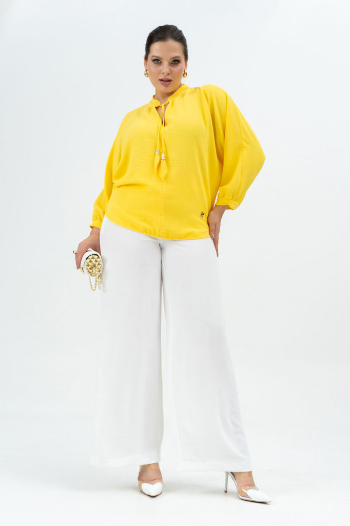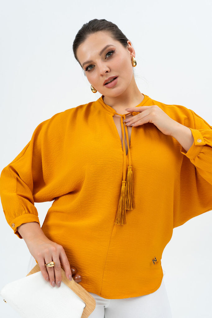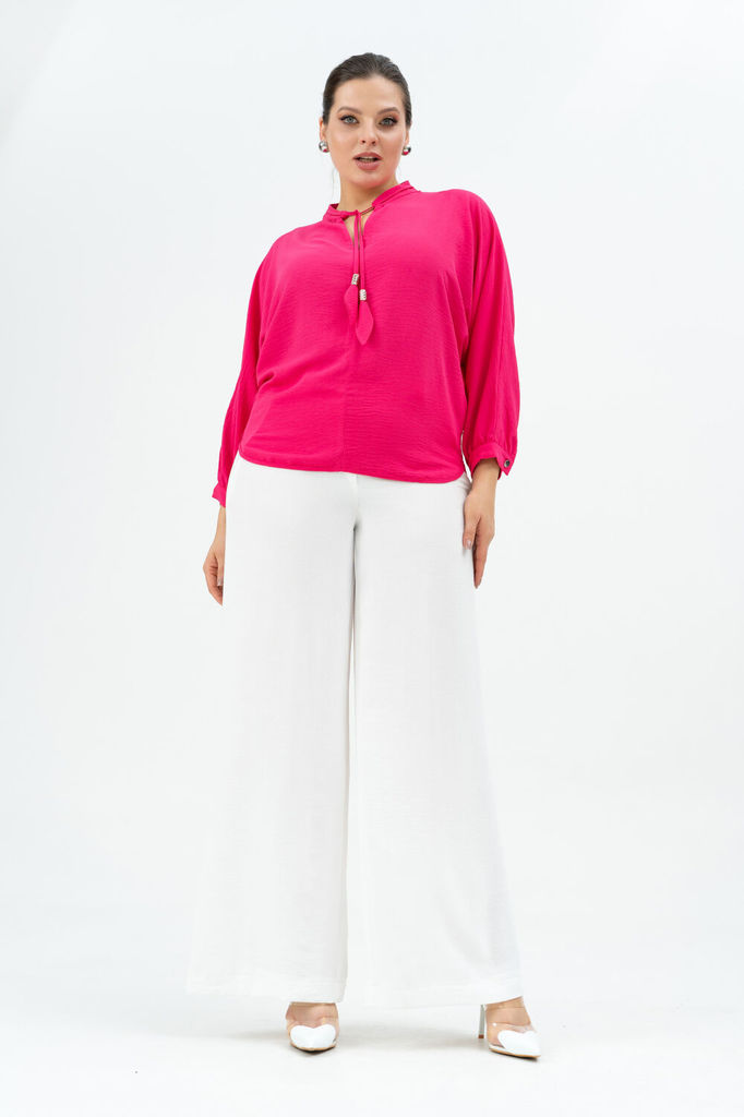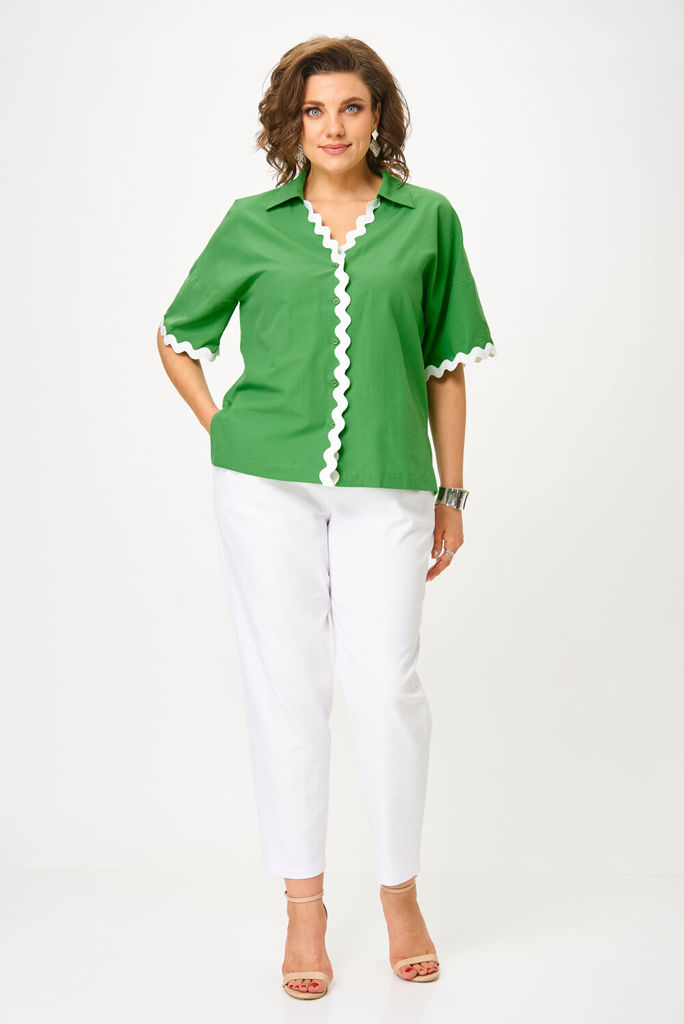 Состав: ПЭ-85%; Хлопок-15%; Женская блузка с отделкой и тесьмой по переду, с втачными рукавами, идеальный выбор для современных женщин, ценящих комфорт и стиль. Свободный крой предоставляет свободу дв... Показать описаниеижений и делают модель еще более удобной. Блузка имеет V-образный вырез горловины, отложной воротник, широкие рукава длины 3/4. Данная модель - идеальный выбор для женщин размера Plus size, прекрасно сочетается с различными типами низа, что позволяет легко комбинировать ее с любыми предметами гардероба. Ткань блузки не мнется, приятная на ощупь. Блузка стильная и элегантная, идеально подойдет для работы, учебы или отдыха, обеспечивая комфорт и стиль вне зависимости от обстоятельств. Таблица измерений изделия в готовом виде М 5033 Наименование измерений/размер 50 52 54 56 58 60 Ширина по линии груди 56 58 60 62 64 66 Ширина по линии низа 59 61 63 65 67 69 Длина изделия по спинке 65 65 65 65 65 65 Длина рукава 39 39 39 39 39 39 Допустимые отклонения +-1-1,5 см