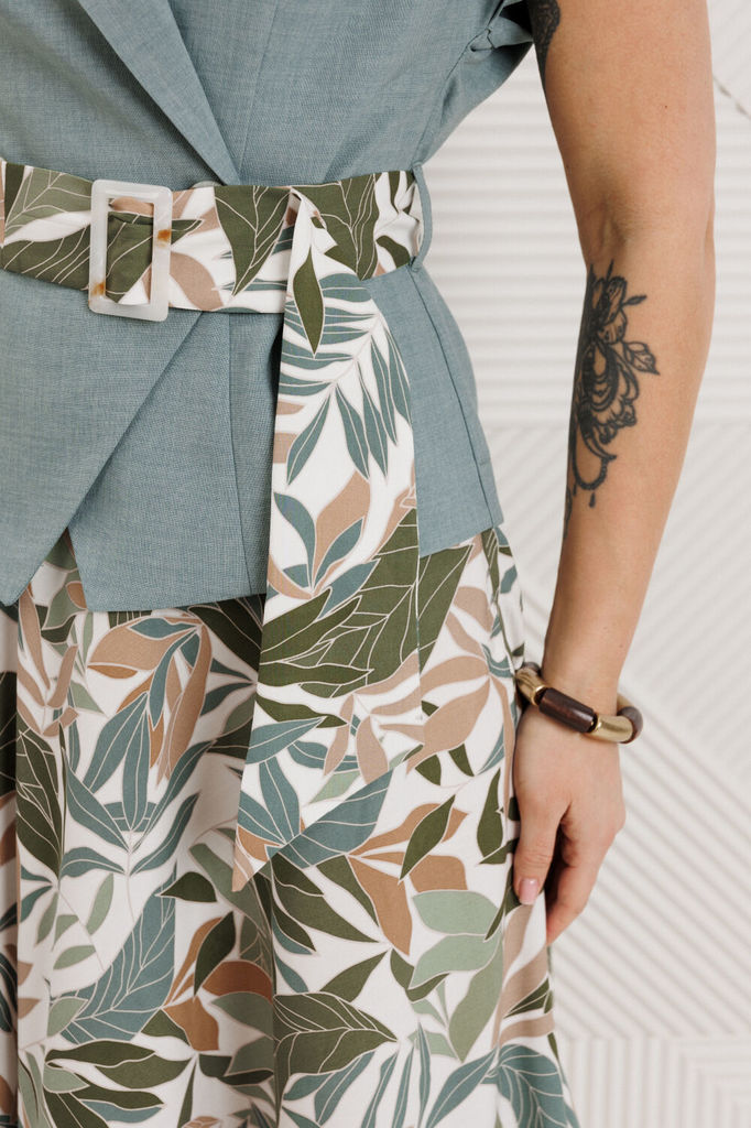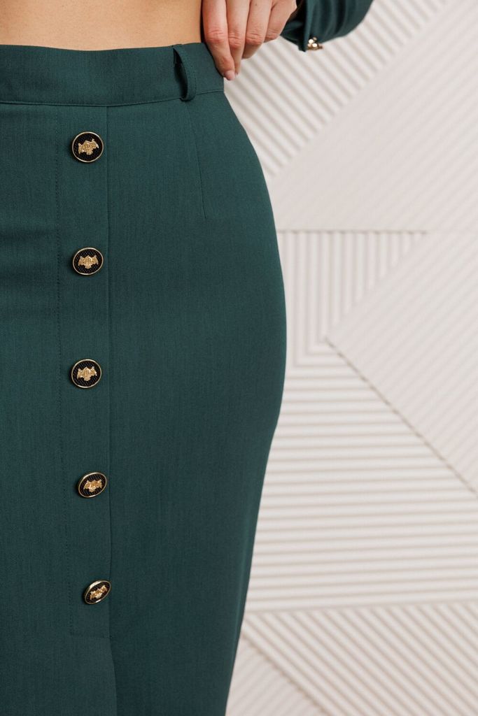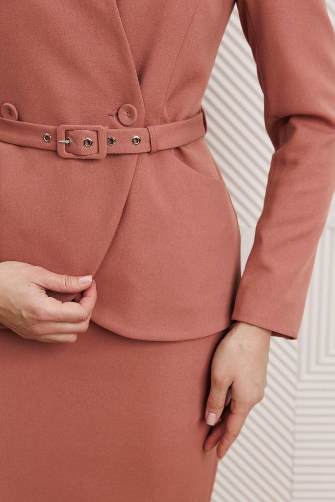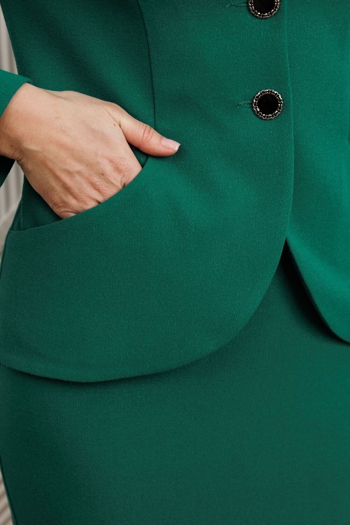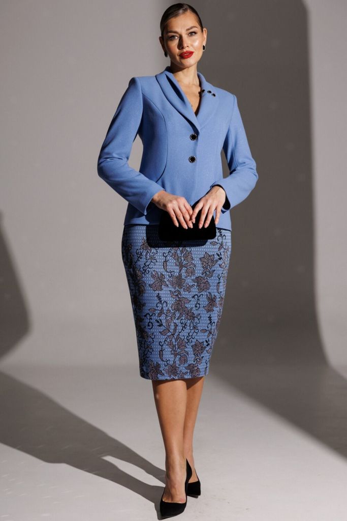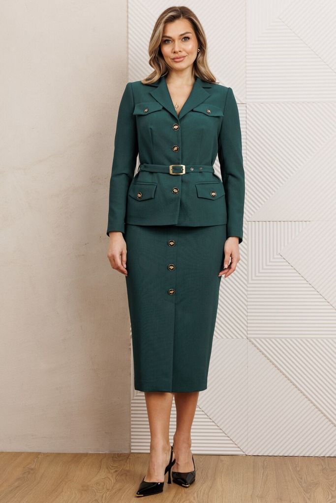 Состав: Вискоза-33%; ПЭ-65%; Спандекс-2%; Комплект, состоящий из жакета и юбки. Жакет полуприлегающего силуэта с центральной застежкой на петли-пуговицы. Спинка со средним швом. По переду – талиевые в... Показать описаниеытачки, карманы с клапаном и декоративные клапаны в области груди. Воротник пиджачного типа. Рукава втачные, двухшовные. Локтевой шов заканчивается отлетной шлицей с декором из ряда пуговиц. Жакет на подкладке. Жакет дополнен съёмным поясом с пряжкой. Юбка-карандаш - воплощение классической офисной элегантности. Ее строгий силуэт, подчеркивающий линию бедер, создает безупречно профессиональный образ. Юбка зауженная к низу. Изюминка дизайна спереди: элегантная шлица, декорированная аккуратной отделкой из пуговиц. Эта деталь не только добавляет динамику и визуальный интерес, но и обеспечивает свободу движения. Боковая застежка-молния обеспечивает аккуратную посадку и легкое надевание, сохраняя чистоту линий спереди и сзади. Притачной пояс с резинкой сзади. На подкладке. Такая юбка является не просто базовой вещью, а законченным стильным акцентом Вашего делового гардероба. Она безупречно сочетается с блузами, жакетами и топами, создавая элегантный и уверенный ансамбль. Замеры 46-52: Жакет: Длина спинки 63 63 63 63 Ширина спинки 39 39,5 40 40,5 Ширина на уровне глубины проймы 51 53 55 57 Ширина по линии талии 49 51 53 55 Длина рукава 61 61 61 61 Ширина по линии бедер 55 57 59 61 Ширина рукава вверху 16,5 17,5 18,5 19,5 Ширина плеча 12 12,3 12,5 12,7 Юбка Длина по боковому шву 84 84 84 84 Ширина по линии талии 39 41 43 45 Ширина по линии бедер 51 53 55 57