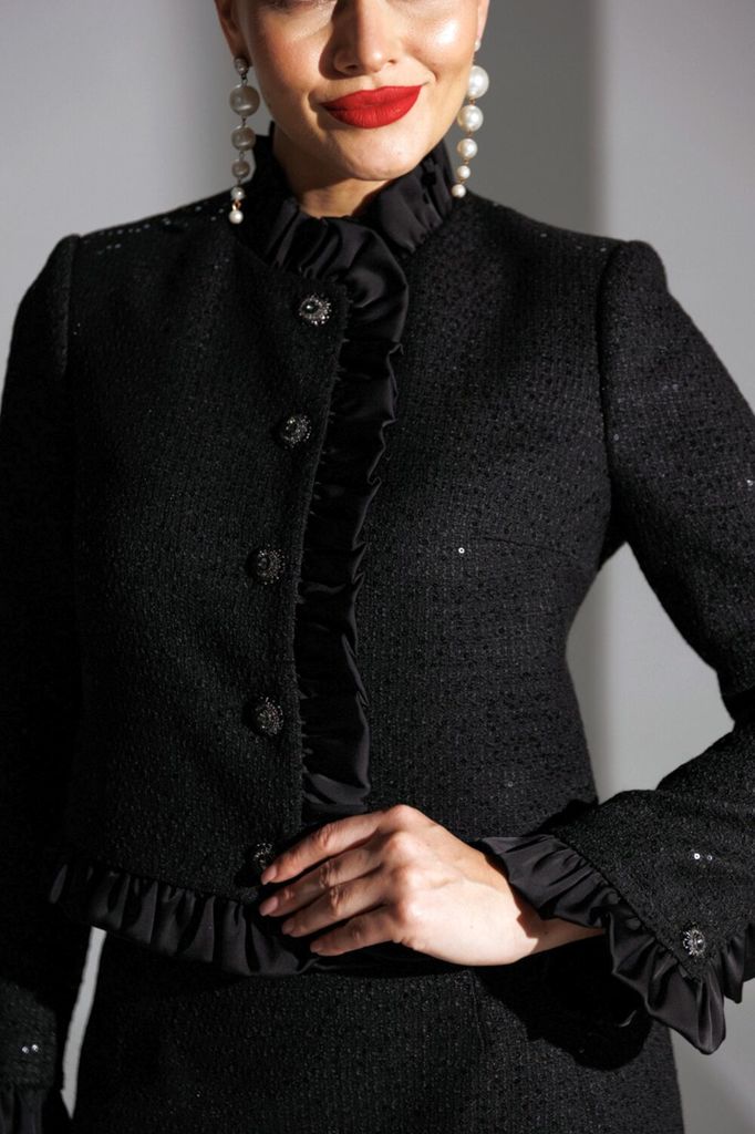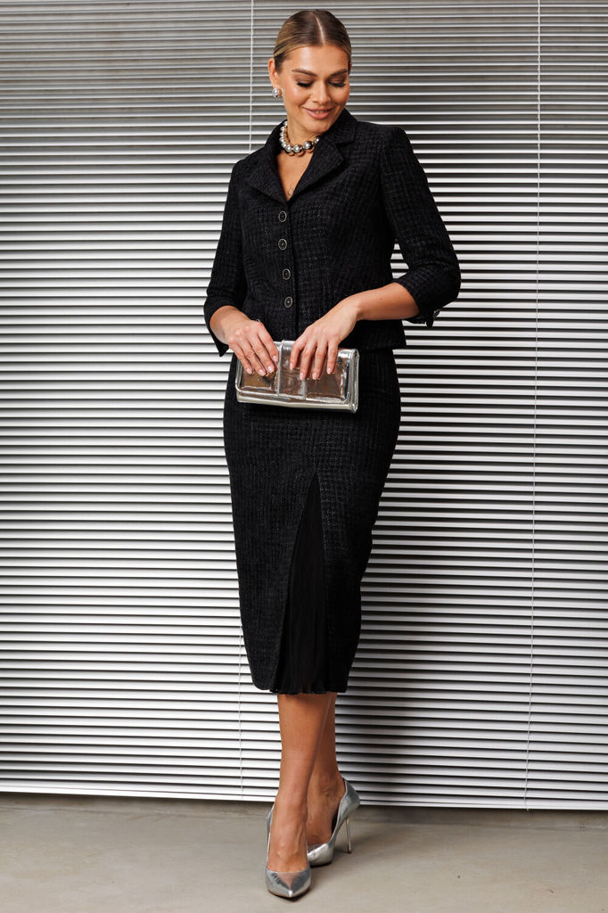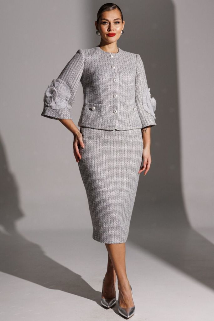 Состав: Хлопок-15%; Люрекс-1%; Полиакрил-84%; Костюм в стиле Шанель, состоящий из жакета и юбки, представляет собой элегантный и стильный ансамбль. Жакет полу прилегающего силуэта имеет центральную за... Показать описаниестежку на петли пуговицы, что придает ему изысканный вид. Спинка жакета оформлена средним швом, а передняя часть украшена талиевыми вытачками, заканчивающимися разрезами, над которыми аккуратно настрочены клапаны с пуговицами. Воротник пиджачного типа добавляет строгости, а рукава длиной 3/4 с шлицей в локтевом шве подчеркивают женственность образа. Юбка выполнена в прямом силуэте с эффектным разрезом по переду, который декорирован отделочной тканью «плиссе», придающей дополнительный шарм. Пояс юбки притачной с резинкой сзади обеспечивает комфортную посадку, а боковая молния облегчает надевание. Вся конструкция костюма выполнена на подкладке, что обеспечивает удобство и приятные тактильные ощущения. Такой костюм идеально подходит для офисной обстановки или деловых встреч, сочетая в себе классический стиль и современные акценты. длина жакета по спинке: 53 см длина рукава: 48 см длина юбки с поясом: 82 см