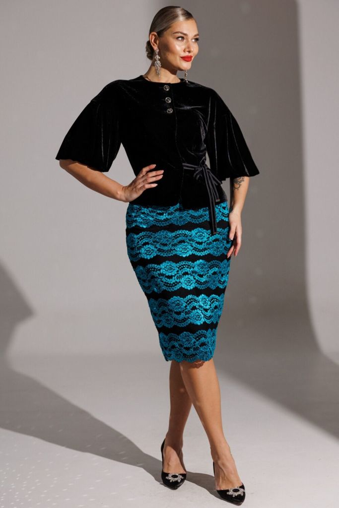 Состав: Жакет: ПЭ-95%; Спандекс-5%; Юбка: ПЭ-95%; Эластан-5%; Нарядный комплект, состоящий из жакета и юбки. Комфортный жакет из велюра полуприлегающего силуэта с центральной комбинированной застежкой... Показать описание на 3 пуговицы и 3 потайные кнопки. Спинка со средним швом и талиевыми вытачками. По переду также талиевые вытачки. Горловина округлой формы. Объемные фантазийные рукава со складками смягчают строгий силуэт. Декором выступают декоративные пуговицы и завязка на талии. Шикарная юбка из сетки с серебряным напылением заужена к низу. Молния и шлица в среднем шве. По талии кокетки. Костюм на подкладке. Замеры 46-52: Жакет Длина спинки 54 54 54 54 Ширина на уровне глубины проймы 48 50 52 54 Ширина по линии талии 43 45 47 49 Ширина по линии бедер 50 52 54 56 Длина рукава от горловины 55 55 55 55 Ширина рукава вверхупо шву втачивания 23 24 25 26 Ширина плеча от горловины до шва рукава 25 25 25 25 Юбка Длина по боковому шву 65 65 65 65 Ширина по линии талии 39 41 43 45 Ширина по линии бедер 51 53 55 57