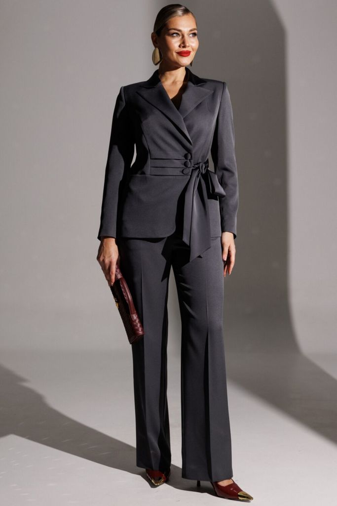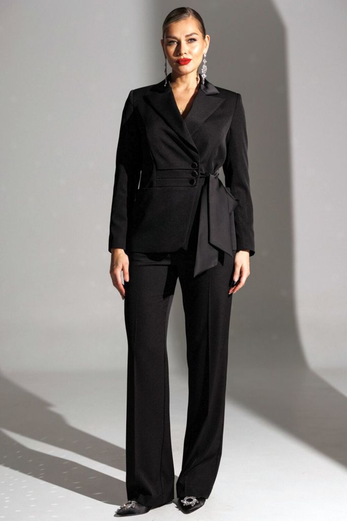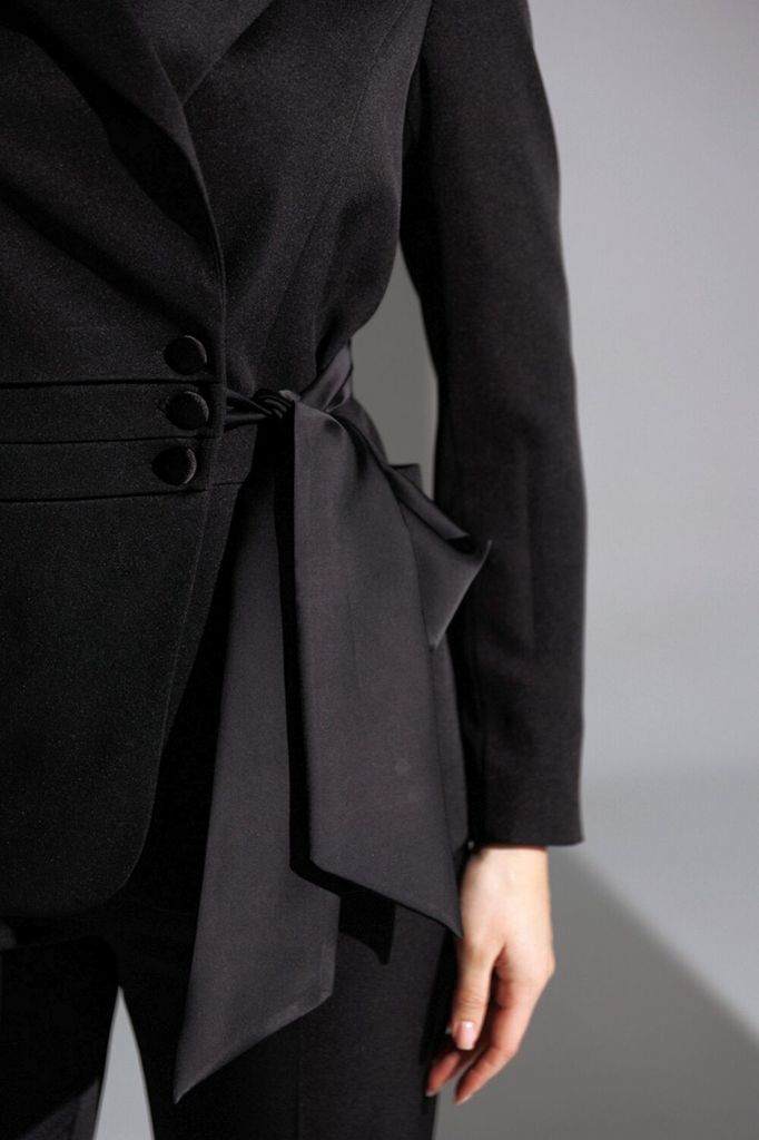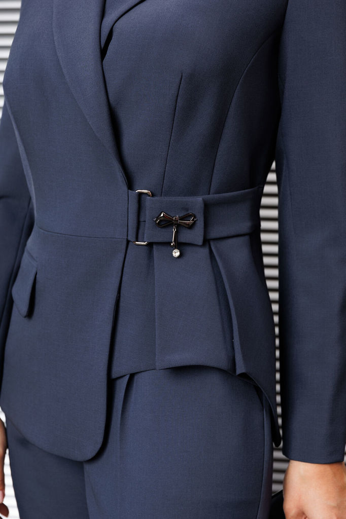 Состав: Вискоза-23%; ПЭ-75%; Спандекс-2%; Жакет полуприлегающего силуэта с двухбортной застежкой на три обтяжные из атласной ткани пуговицы и одной потайной. Край борта овальной формы, что придаёт жак... Показать описаниеету утонченность. По переду обработаны фигурные рельефы из проймы, также имеется горизонтальный подрез,в котором расположены карманы. На правой центральной части полочки - три складки, параллельные подрезу. Дополнительно с левой стороны завязывается атласный бант,что придает нарядность и особый шарм. Одна часть банта крепиться на пуговицу, другая в боковом шве. Спинка со средним швом и вертикальными рельефами из проймы. Воротник пиджачного типа из атласной ткани с пикообразными лацканами. Рукава двухшовные, со шлицей в локтевом шве на одну пуговицу, также обтяжную из атласа. Жакет на подкладке. Брюки классические,со стрелками,с притачным поясом-сзади частично на резинке для удобства и комфортной посадки. На поясе имеются пять шлёвок. На передних половинках присутствуют карманы. Застёжка на молнию и пуговицу. Костюм выполнен из качественной костюмной ткани с отделкой из атласа. Замеры 46-52: Жакет Длина спинки 67 67 67 67 Ширина спинки 38 39 40 41 Ширина на уровне глубины проймы 51 53 55 57 Ширина по линии талии 46 48 50 52 Длина рукава 62 62 62 62 Ширина по линии бедер 52 54 56 58 Ширина рукава вверху 17 18 19 20 Ширина плеча 11,8 13 13 13 Брюки Длина по боковому шву 109,5 109,5 109,5 109,5 Ширина по линии талии 43,5 45,5 47,5 49,5 Ширина по линии бедер 52 54 56 58